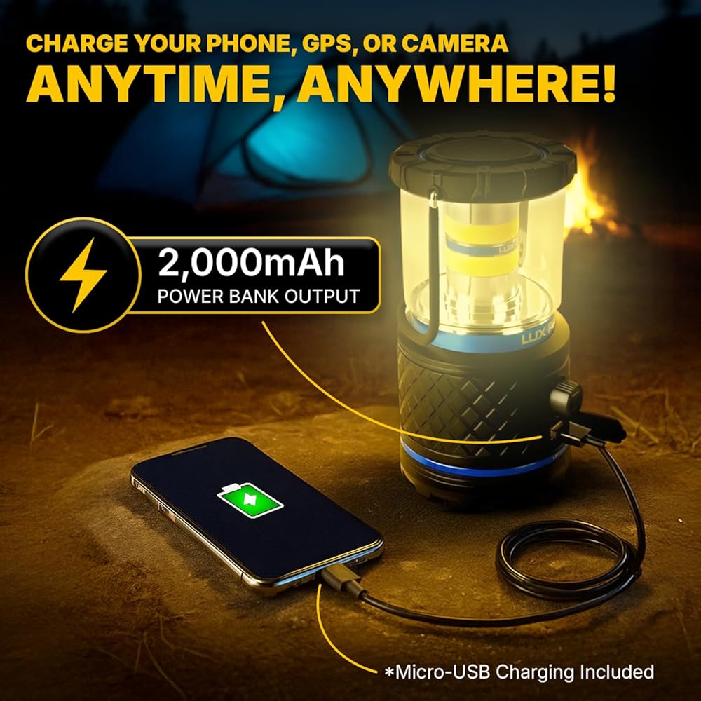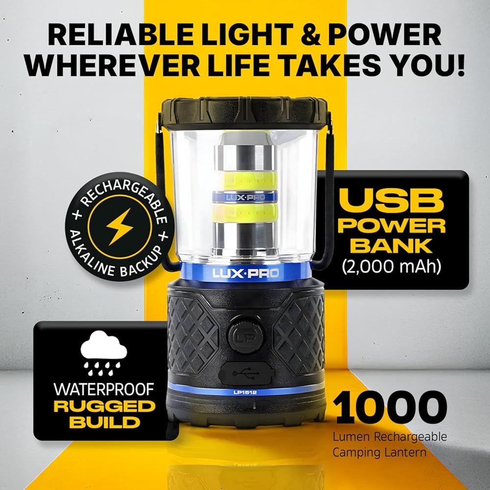 LUXPRO Rechargeable Dual-Power 1100 Lumen LED Lantern for Up to 150 Hours of Use - Camping Lantern with Built-in Power Bank - Dimmable LED Light with IPX4 Water-Resistant Rating (Camping Lantern)