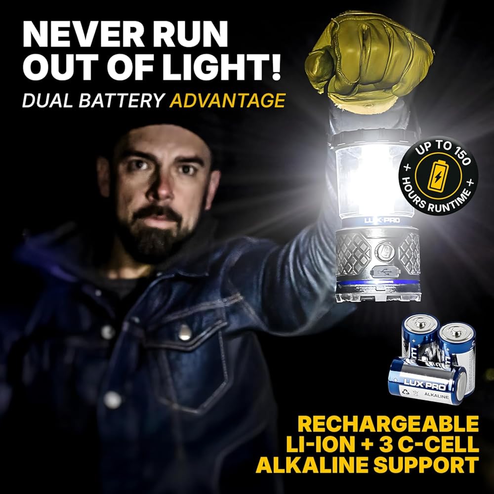 DUAL BATTERY DESIGN – RECHARGEABLE OR ALKALINE: The dual battery design provides up to 150-hour runtime. This lantern comes with a rechargeable Li-ion battery, but can also operate with standard alkaline batteries in tandem or interchangeably; in case of an emergency. Just add 3 C Cell batteries for the extended run-time! The UL recognized 2000mAH rechargeable battery is included so start your DIY projects or camping adventures immediately!