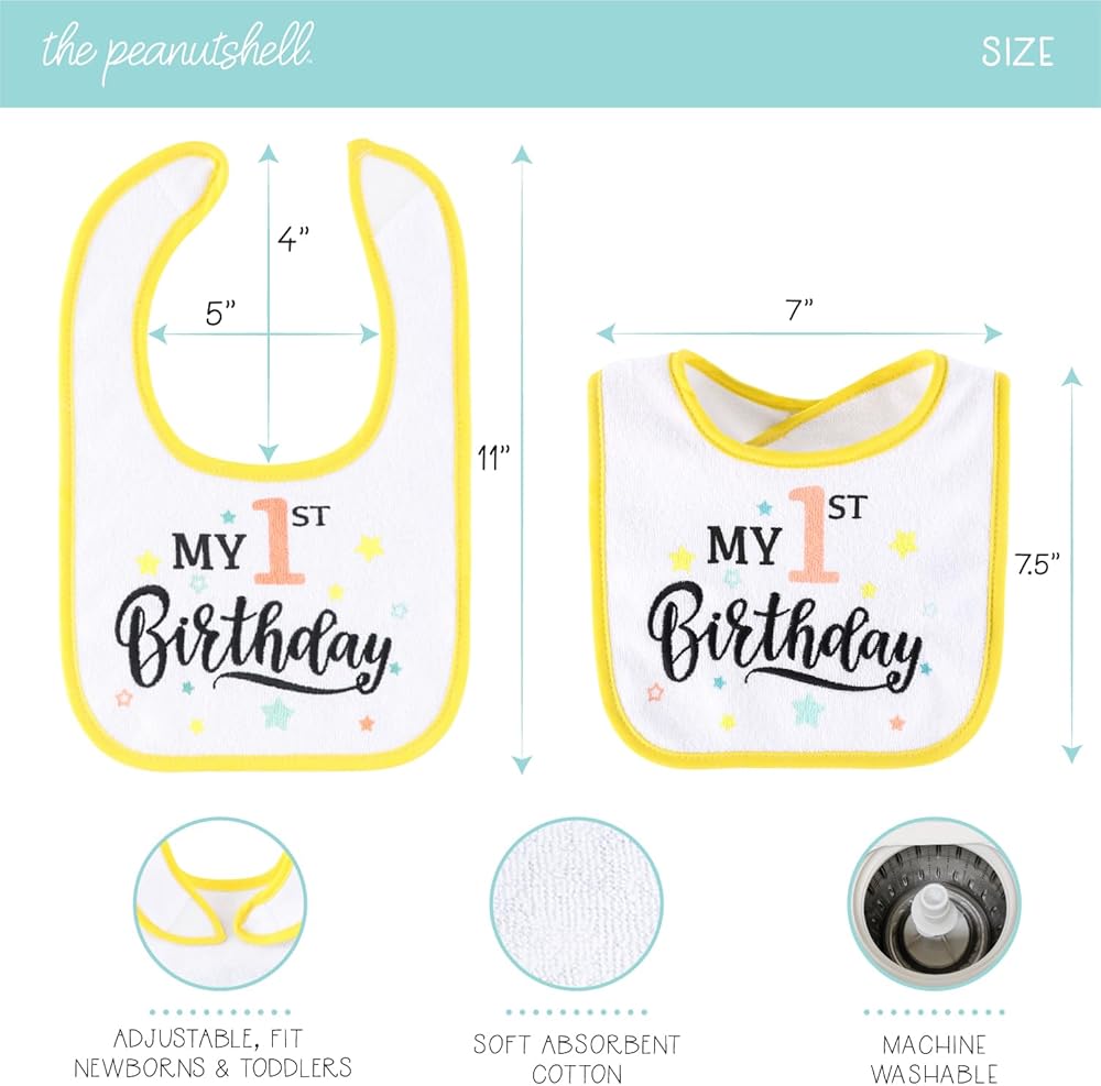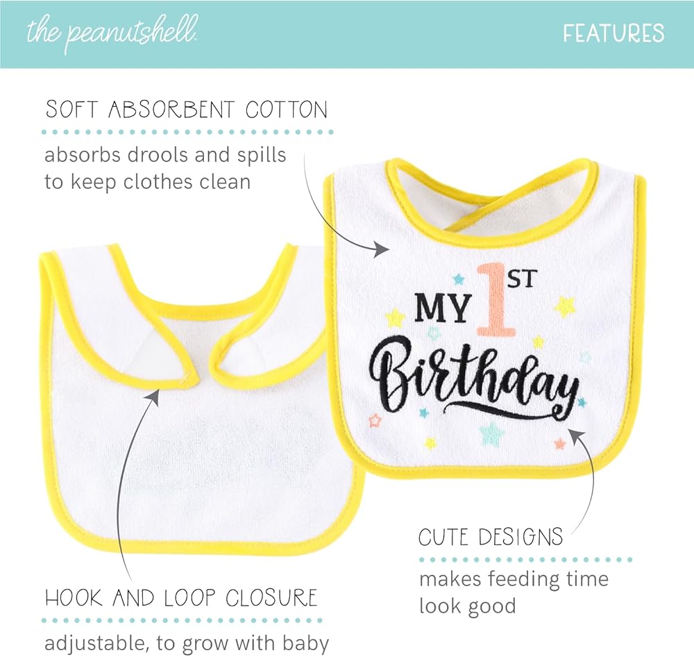 Celebrate baby's first milestone year with this 9 piece Holiday Terry bib set from The Peanutshell. Keep messes to a minimum with the perfect multi-pack for feeding, teething and drooling babies. The Holiday collection features 10 festive sentiments in bright and vibrant colors. The super soft cotton blend terrycloth is absorbent, machine washable and fade resistant. Easy to use hook and loop closure allows for quick changes and cleanup at a terrific value that's optimal for everyday use. The stylish sayings adjust to fit newborn to toddler size. Our outfit saving essentials make a thoughtful baby shower gift for new parents.