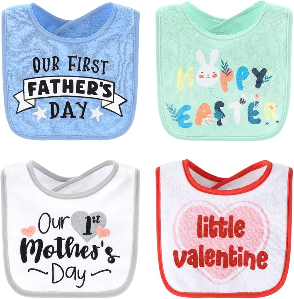 9 Loveable Bib Designs: Quickly clean up your baby's adorable face from spills, spit ups, dribbles, and drool. A fun assortment of cute sayings for Easter, First Birthday, Valentines Day, Mother's Day, 4th of July, Halloween, Thanksgiving, and more.
