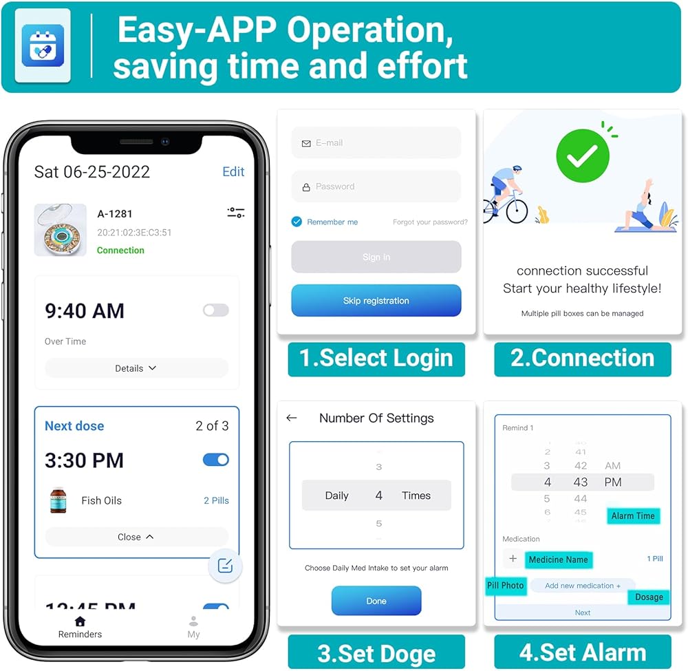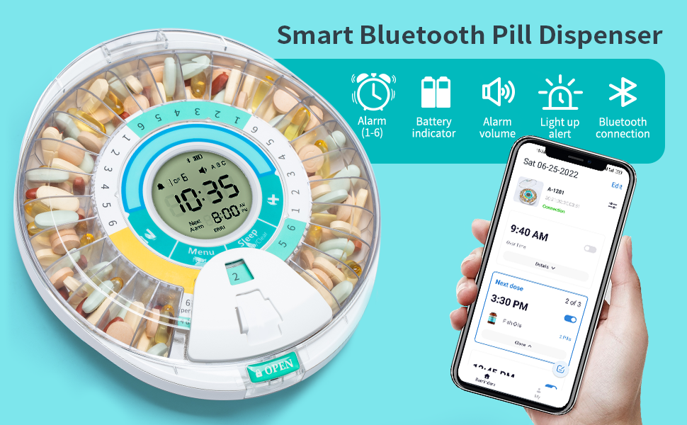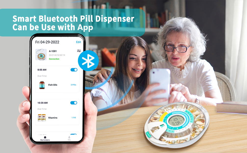 [Bluetooth Connection] Turn on Bluetooth to connect pill dispenser and mobile phone. Through the APP that can set the pills and alarm time, view meds records, and monitor whether the meds is timely taked.