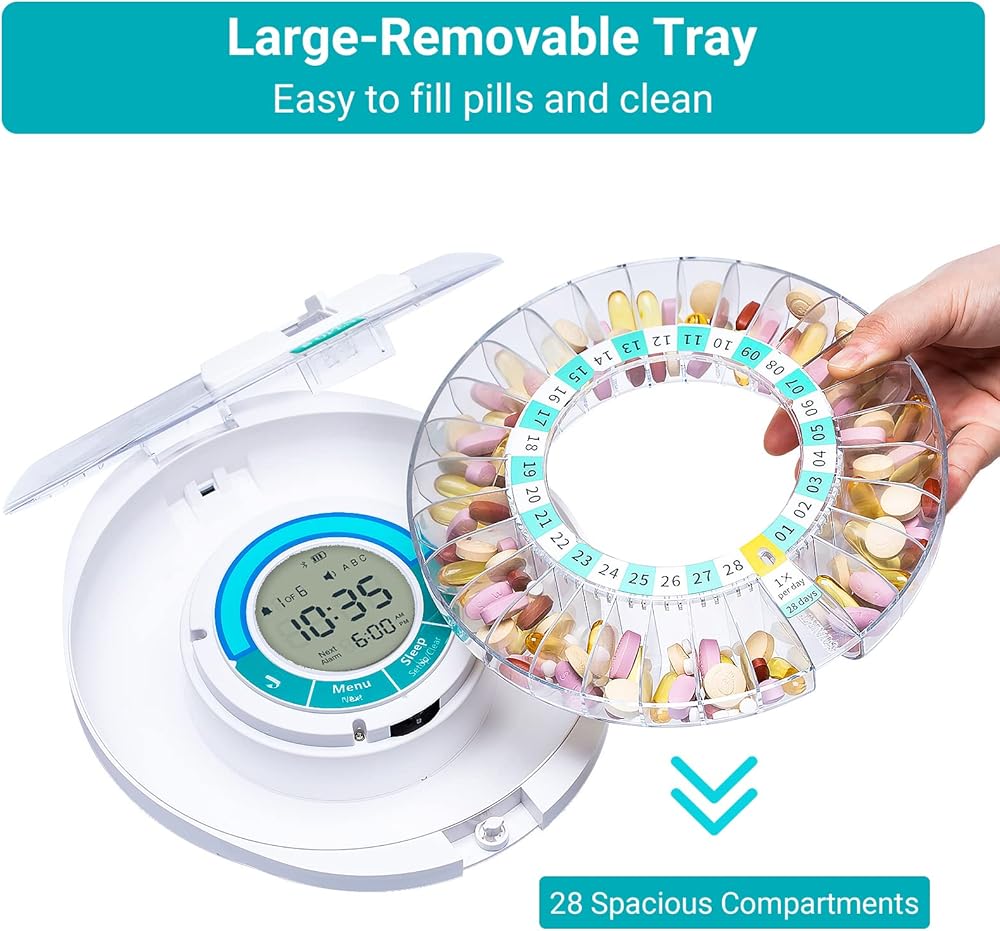 Zoksi New Bluetooth Smart Automatic Pill Dispenser, Electronic Medication Dispenser for Elderly, 28 Compartments Medicine Organizer with Triple reminder