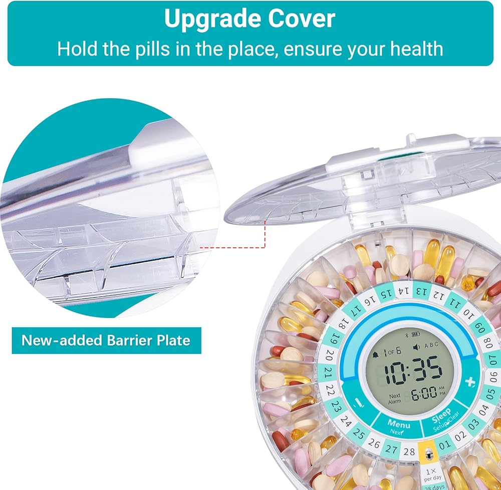 [Upgraded Design] New-added barrier plate - hold pills in the place to protect your meds safety; New way to open/close the lid-by toggling the swing arm left or right; The Bluetooth connection is more stable and smooth, giving you exclusive experience.