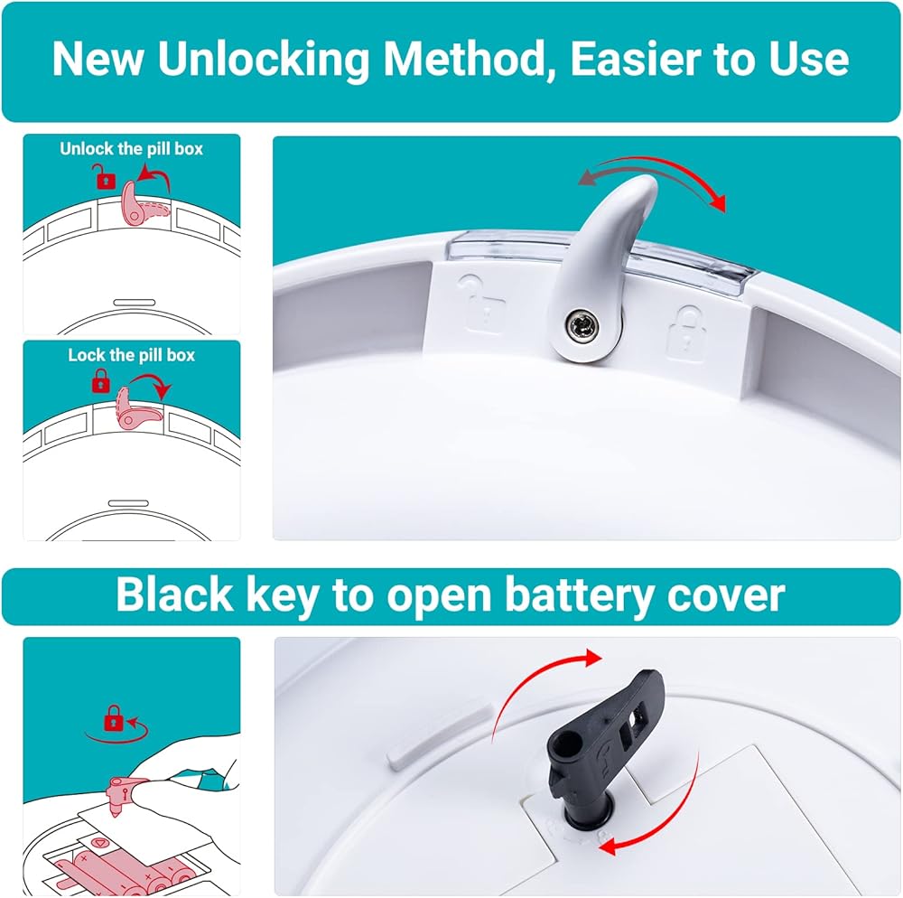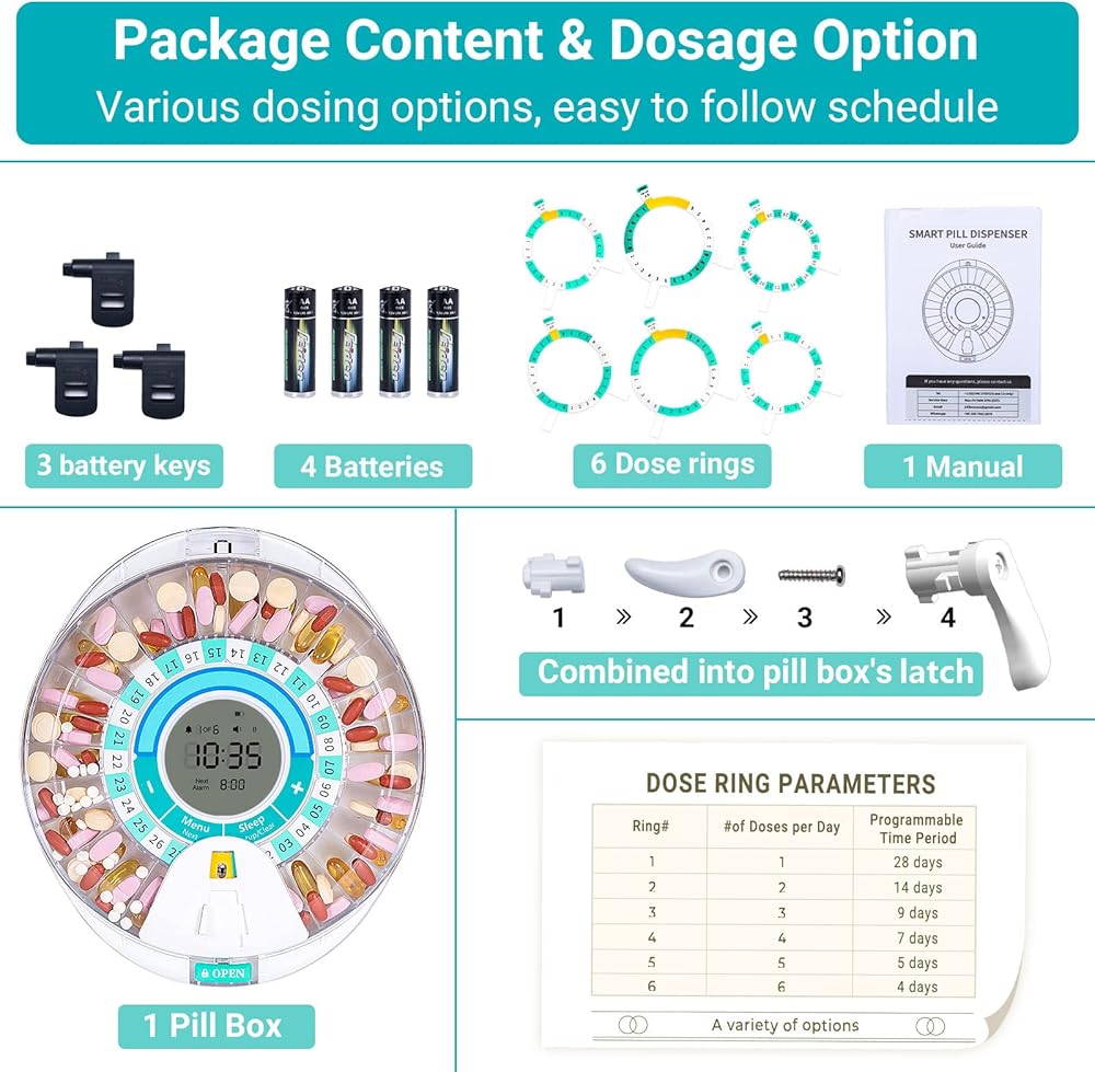 [Pakage Contents] Pack with 1 Pill Box, 3 batery keys , 2 cover keys(Assemblable), 1 Instruction Manual, 6 interchangeable Dosage Ring and 4 AA batteries(no need charge).
