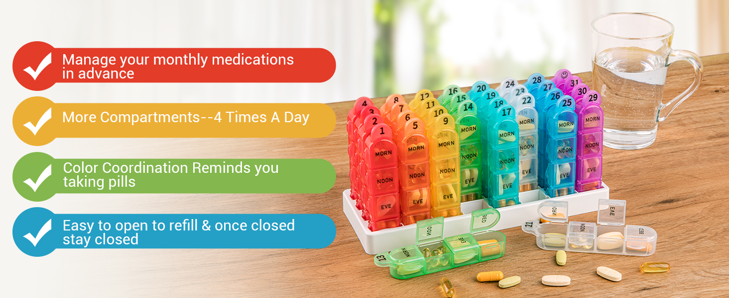 【1 Day 1 Pill Box】 31 day pill organizer and extra 1 for extra dose can be carry individually for purse or bag. With snap shut lids, the portable pill holder once closed stay closed. Perfect for on-the-go trip or travel, just grabing the days you need and go.If taking the whole set medicine organizer, make sure to prepare a case for the 30 day pill box four a day.