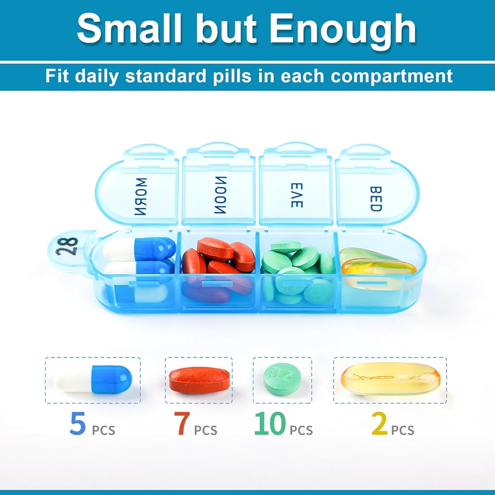 【Easy to Use】The month pill box organizer features two unique tabs or handles on the lid and top on the daily removable pill case, easy to open each slot and take out 31 day pill box from the base. Perfect for the elderly or people with the arthritis. 4 times a day pill organizer has 4 compartments each day with small but enough capacity for daily medicines. The size of each compartment is 0.98"L x 0.87"W x 0.59"H, each can hold 2-3 fish oils or 5 standard capsules.