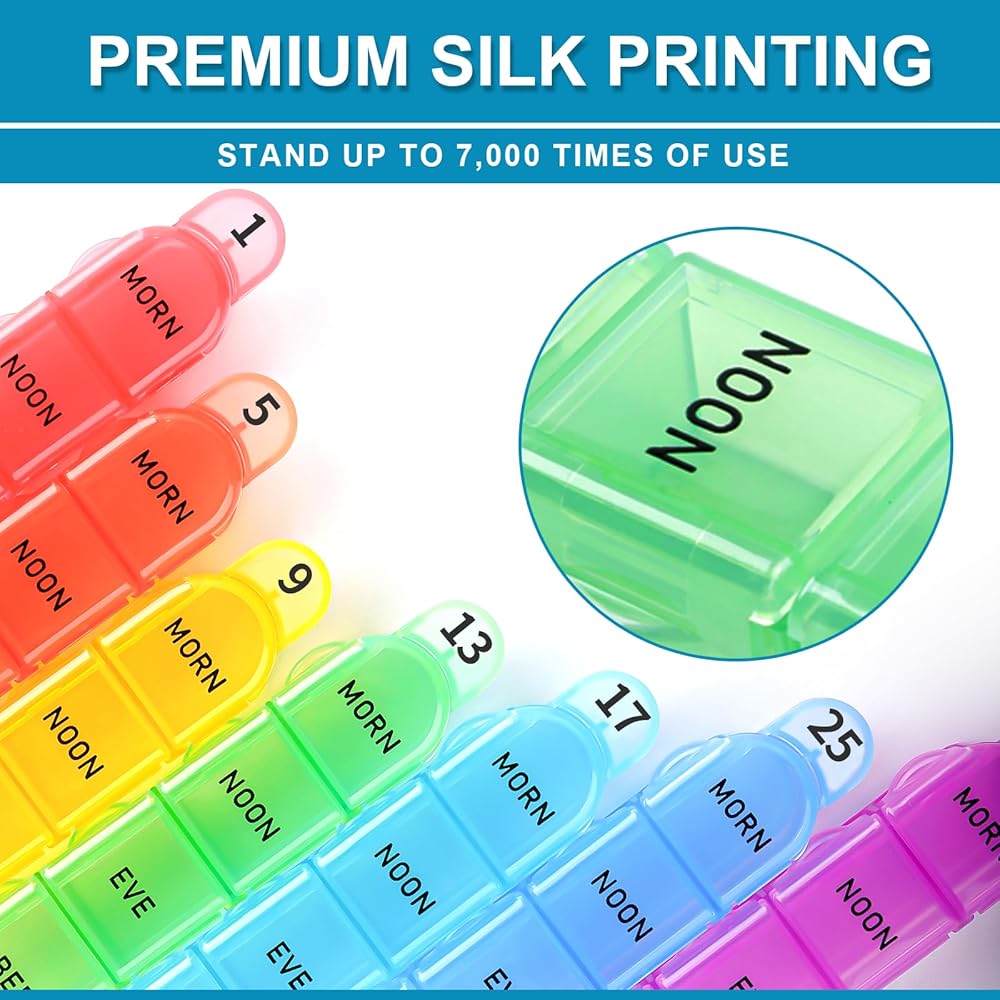 【Premium Silk Printing】Zoksi pill organizer 4 times a day printed by self-developed silk printing, which is wear-resistant and sweat-resistant. By testing, the MORN-NOON-EVE-BED labels will never rub off for over 6,000 times of use.