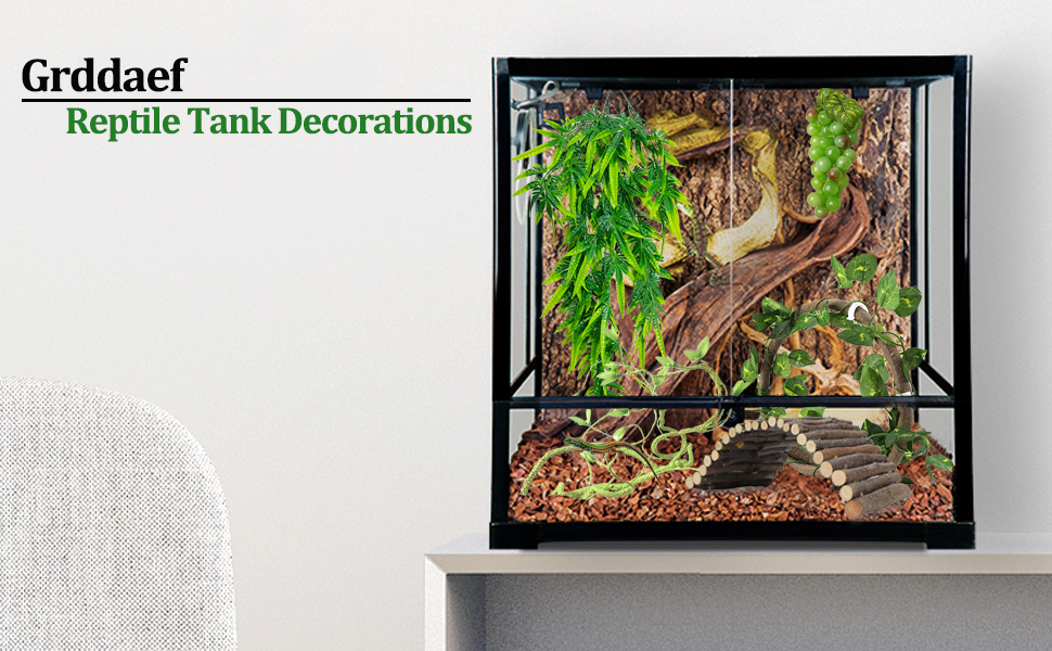 【Safe Material】Reptile bridge is made of natural wood material. The jungle vine is made of iron wire inside and soft PU material outside. Reptile hanging plants is made of plastic.