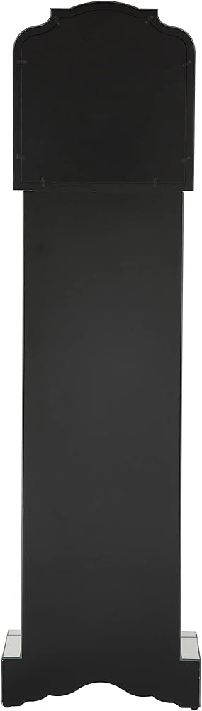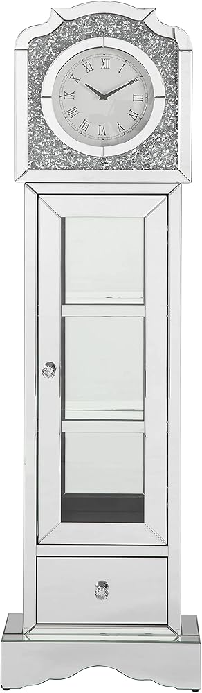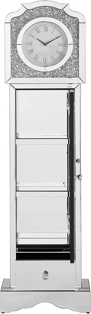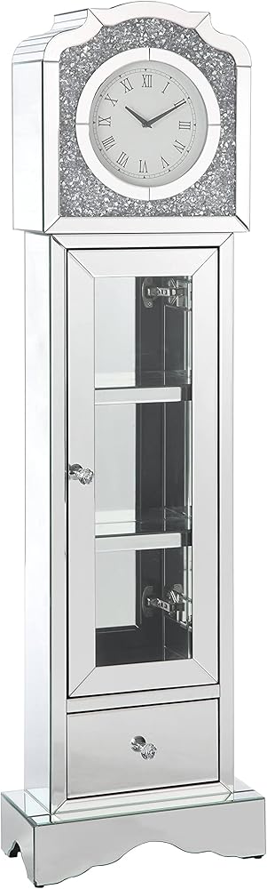 A striking juxtaposition merges a timeless classic with chic, glam elements in this contemporary grandfather clock. Covered entirely in an intricately cut mirror tile and trim, this elegant grandfather clock offers a refreshing take on telling time. A traditional round clock face offers Roman numerals and slender hands and is set inside a faux diamond-encrusted mantel that glitters and sparkles. Doubling as a curio cabinet, this grandfather clock features a single glass door that showcases decor along the mirror shelves inside and a single bottom drawer to store other everyday items.