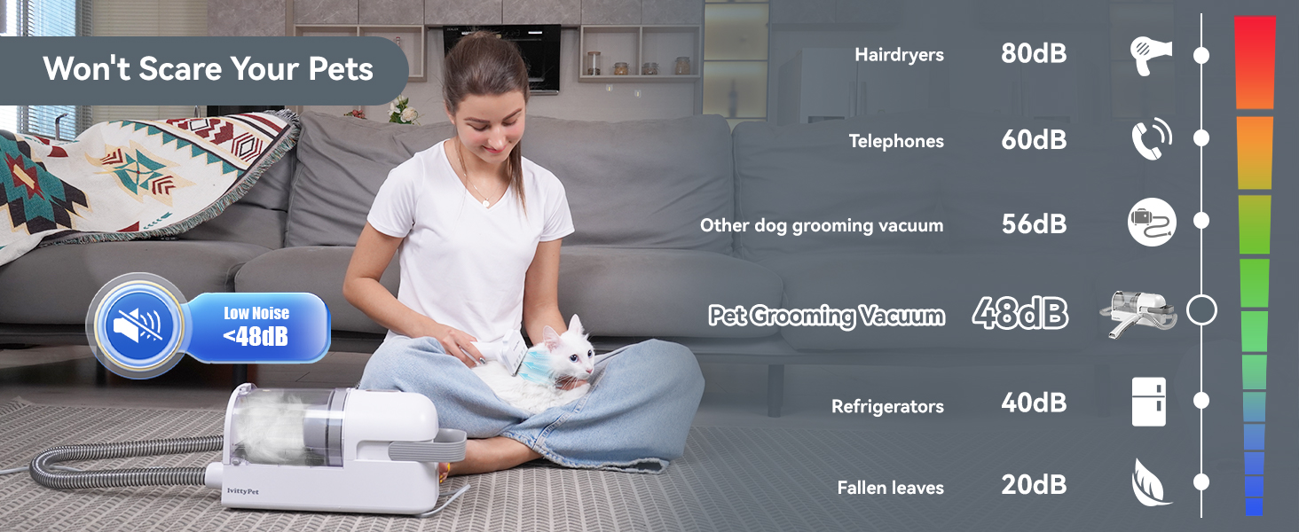 🐶【Low Noise Design】Say goodbye to the noisy grooming experience! Our pet grooming vacuum is designed with low noise! Our pet vacuum for dogs is designed with low-noise technology to ensure a quiet and stress-free environment for you and your furry friend during the grooming process. With a noise level of only 52 decibels, your pet's sensitive hearing is effectively protected. Beginners can start at a low speed to get used to the machine.