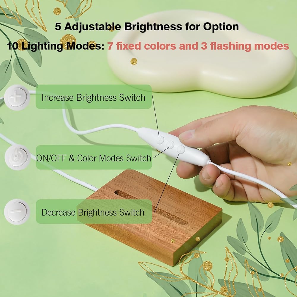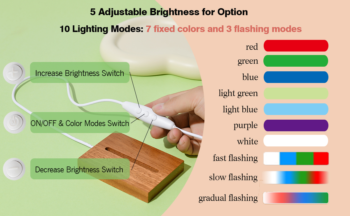 10 different light modes: The wooden LED light base bracket has 7 fixed colors: red, green, blue, light green, light blue, purple, white, and 3 light flashing modes, which are fast flashing, slow flashing, and gradual flashing.