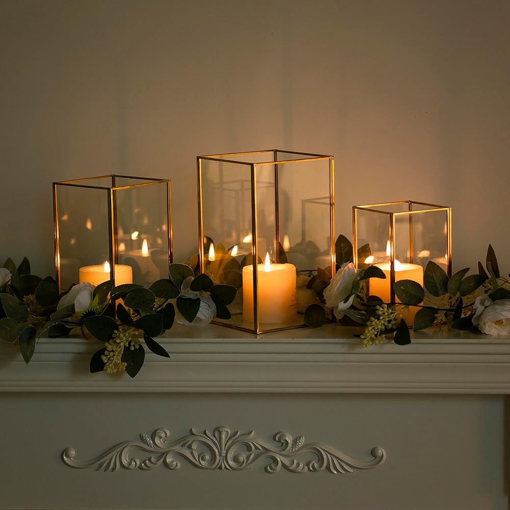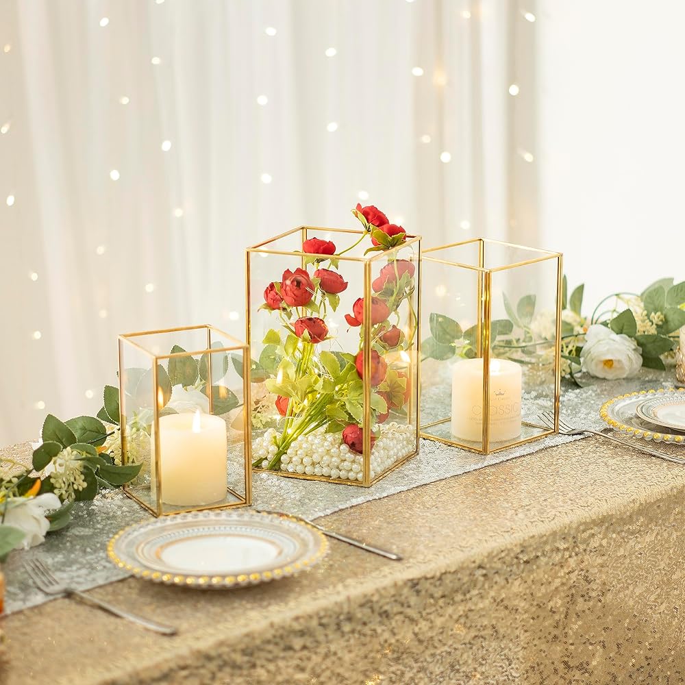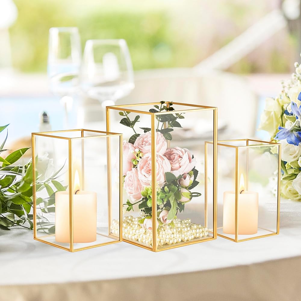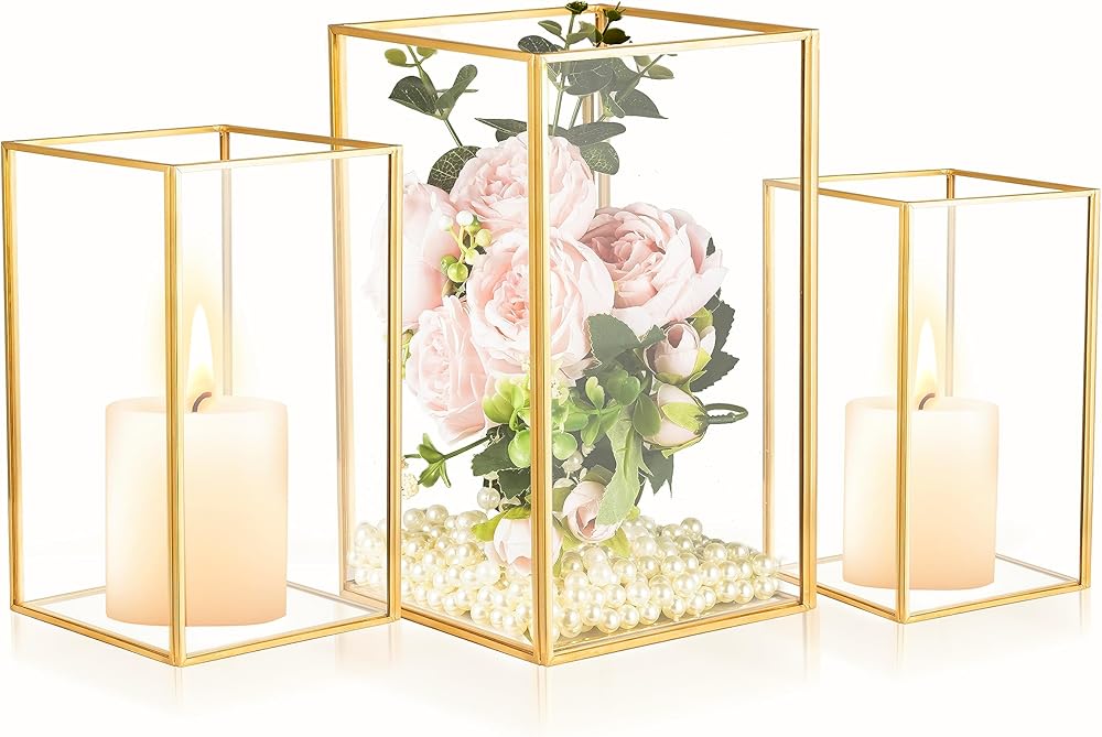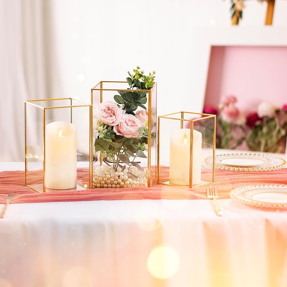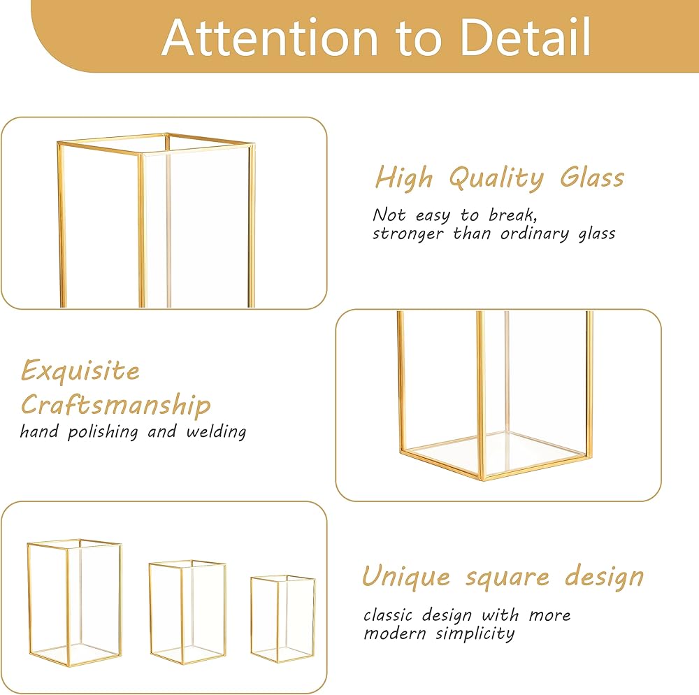 Hurricane Glass Candle Holders for Table Centerpiece, Set of 3pcs Modern Gold Candle Holder for Pillar Candles, 3 Size Square Clear Glass Candlestick for Wedding Party Home Decor(Gold)
