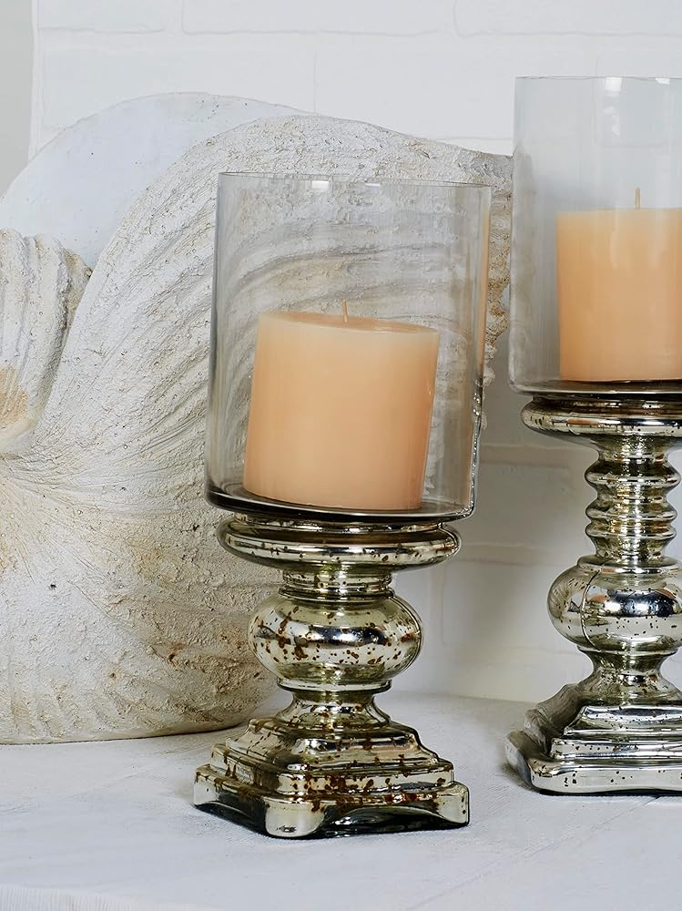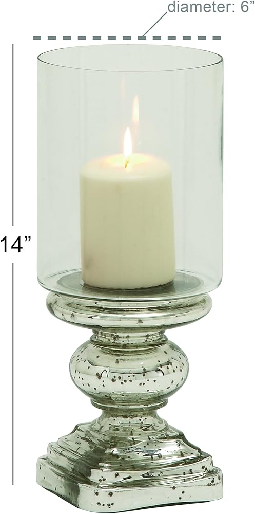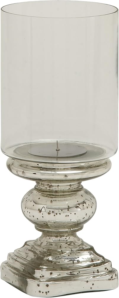SILVER AND CLEAR GLASS FINISH: Speckled metallic silver candle holder base with a turned column silhouette and transparent large hurricane glass cover