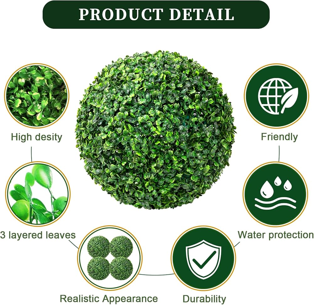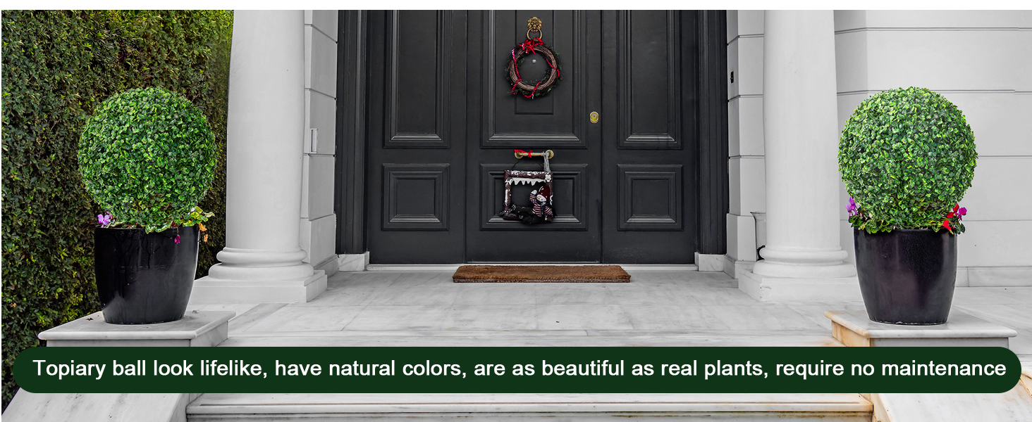Maintenance Free: Artificial boxwood balls are designed to look just like real plants, with lifelike leaves and a lush green color. And they don't require any water, soil, or fertilizers, do not need to be trimmed, are easy to maintain, and are not affected by natural weather