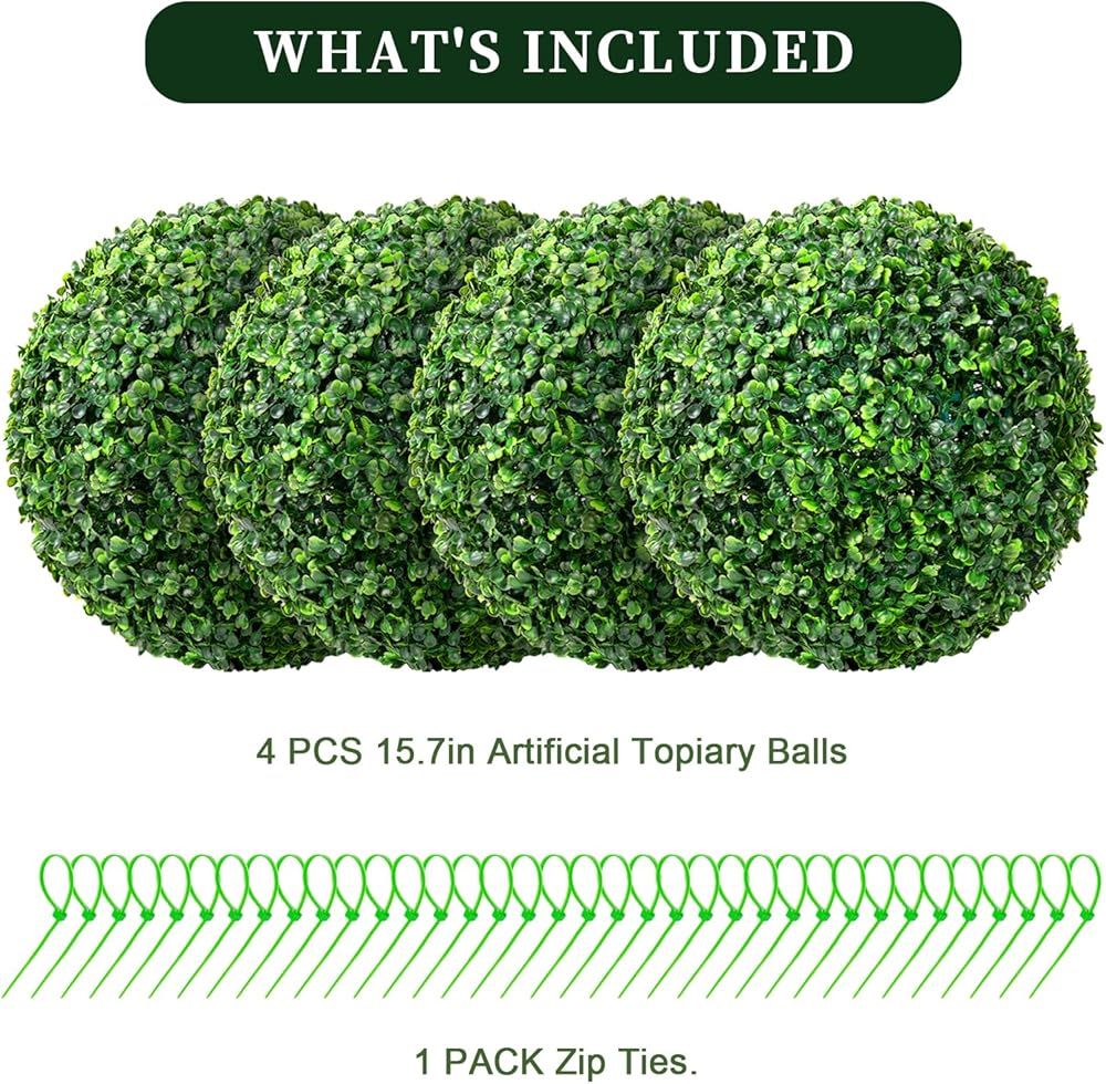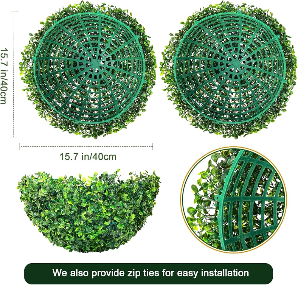 Package Included: The package comes in 8 halves balls, just connect the clip and you will get 4 round boxwood balls. 4 packs of outdoor artificial plants balls, dark green, diameter 15.7 inch