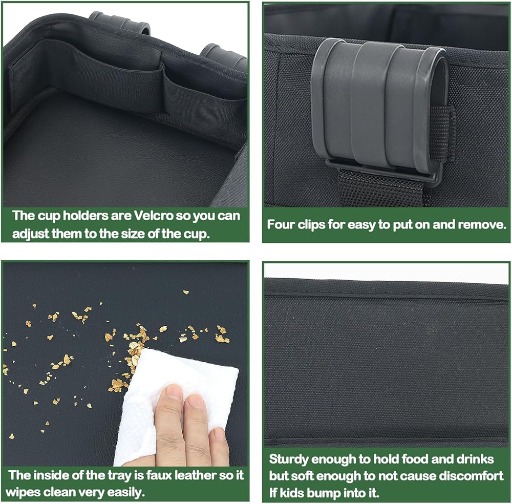 Easy to Install : Four clips make installation simple and super easy to put on, clean and remove.The snacks tray has 2 mesh pockets and 2 Velcro straps for easy storage of items and cups.If you have any questions please contact us by free, we will provide refund / replacement to you.