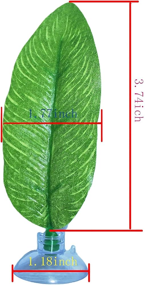 [Soft single leaf design]: leaf, 1.77 inch wide, 3.74 inch long, suction cup diameter 1.18 inch. The leaves don't contain iron wire, so they won't scratch the betta and rust. You can bend the leaves up and down, which is very suitable for beta fish to play and hide.