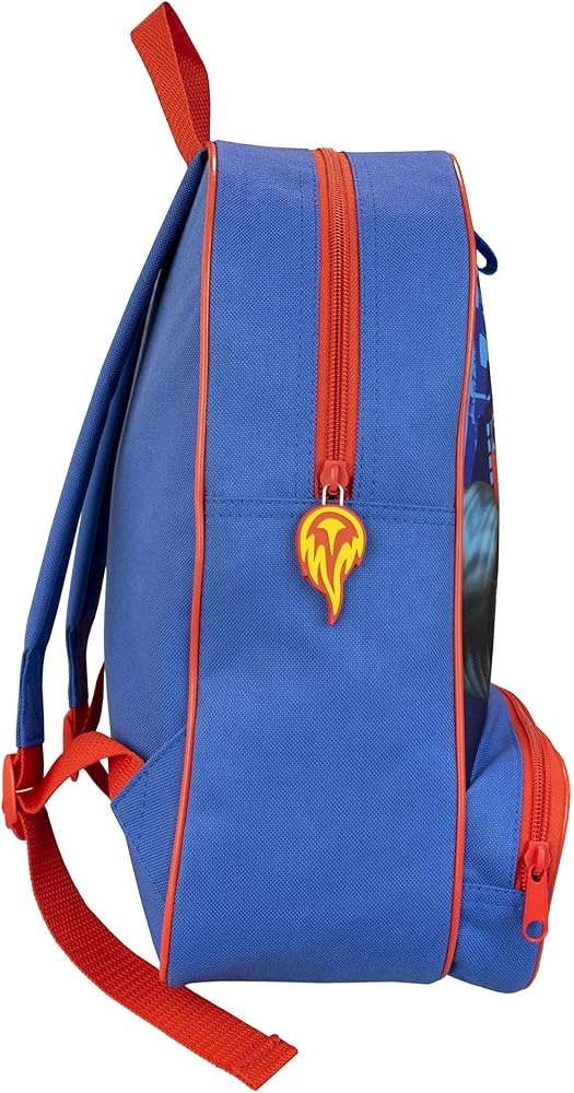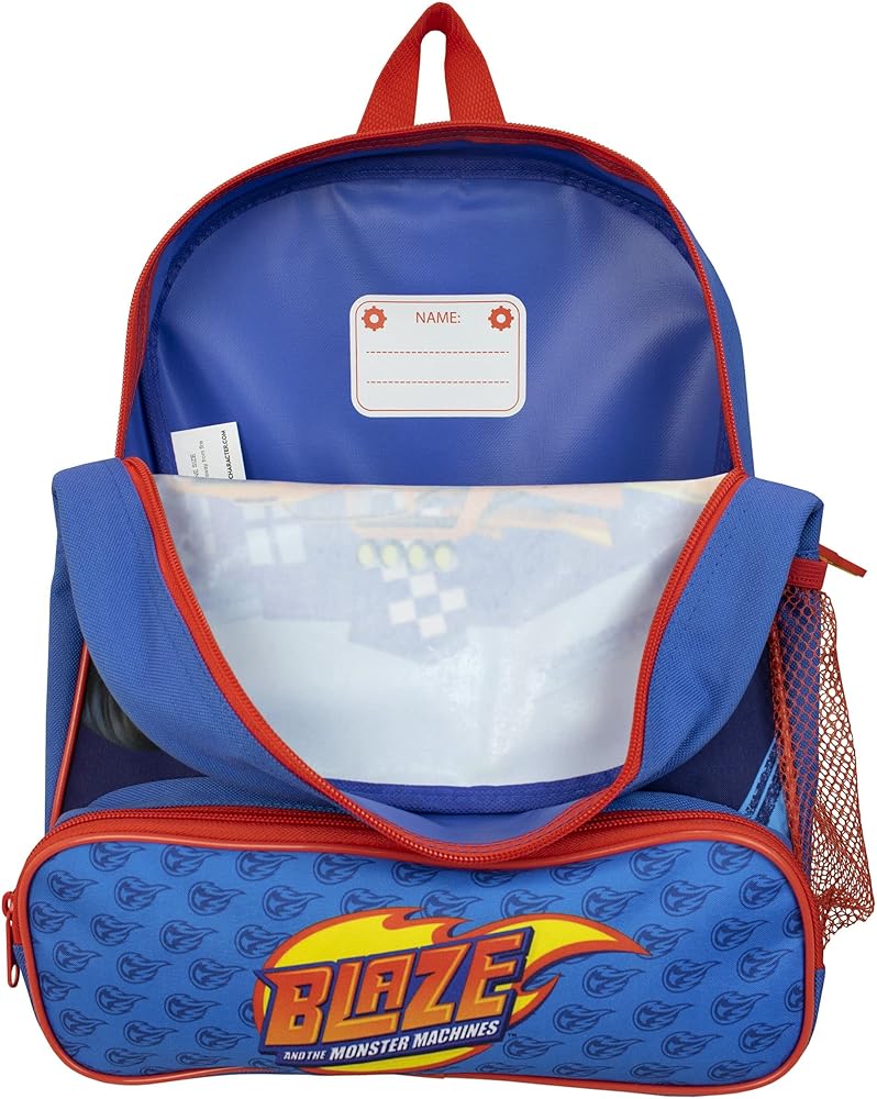 This blue and red rucksack showcases a vibrant print of Blaze, with a rubber flame zip pull, mesh side pocket and outer pocket featuring the 'Blaze and the Monster Machines' logo. Comes with a matching detachable lunch bag. Approximate Dimensions: Backpack: H:14 x W:11 x D:5 inches Lunchbag: H:7.5 x W:10 x D:3 inches
