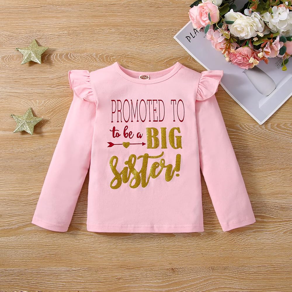 Announcement Promoted to Big Sister Outfit Size: Toddler girls big sister little sister matching outfits suitable for 2-7 years old girls, 12-18m,2-3t, 3-4t, 4-5t, 5-6 years, 6-7 years girls. Please check the size chart before you order it. Thank you! 3 colors for your kids choice, pink, white and black.