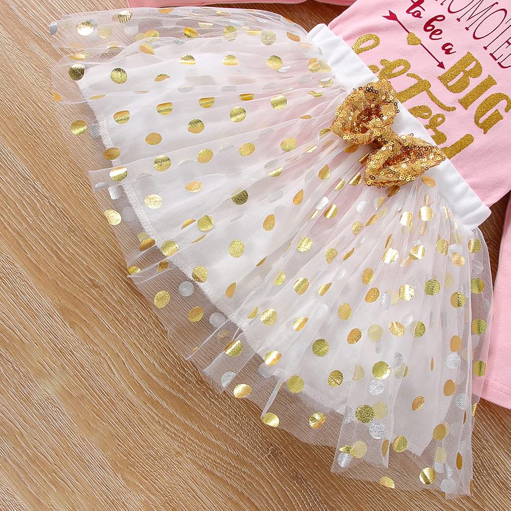 Announcement Promoted to Big Sister Outfit Design: Cotton Big Sister shirt is printed with glittery letters 'Big Sister' and crown pattern. Short skirt is 2 layers of fabric design, the outer layer has gold dot bubble sequins and a shiny gold bow knot, the lining is soft cotton material. Cute big sister outfits for toddlers, it will make your little girl be a star in the party