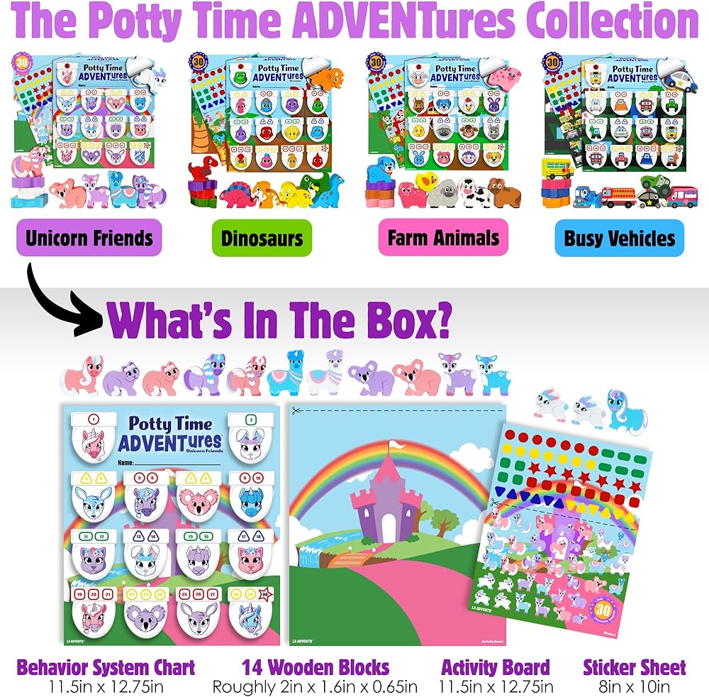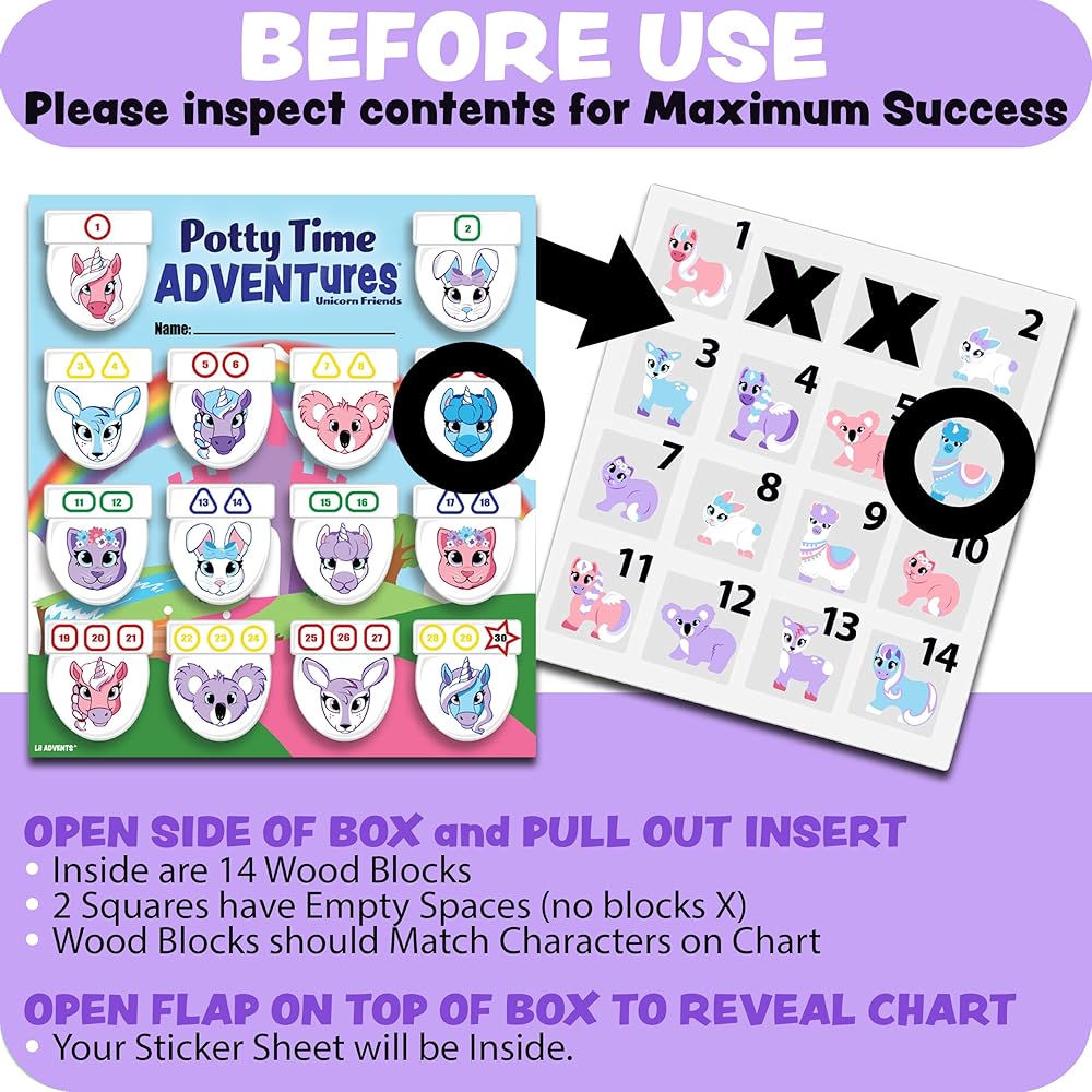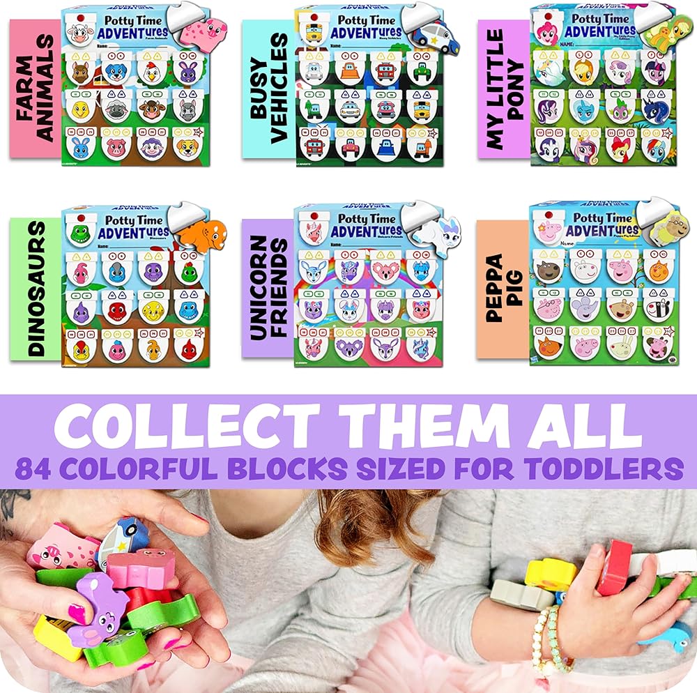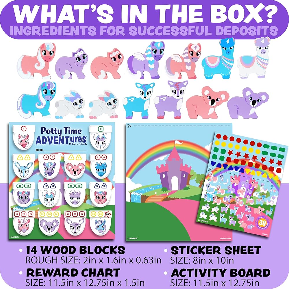 REWARDS INCLUDED: Comes with PTA Chart, 14 potty punch-outs with 14 CPSC safety certified wood blocks (18 months & up), activity board, shape stickers, themed stickers, & sticker of completion badge.