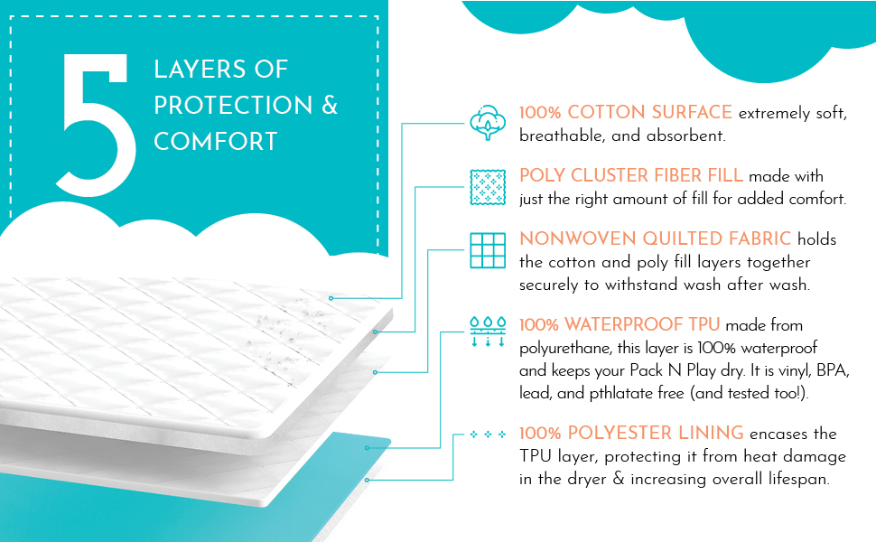 EVERYTHING YOU NEED TO KNOW: Noiseless & soft high quality materials and construction. It absorbs amazingly, it's soft and comfy, it is fitted, and it will fit most 1” – 5” play yard or pack n play portable mattresses. It's quiet, breathable, & BPA and toxin free. And if you want to know more read on!