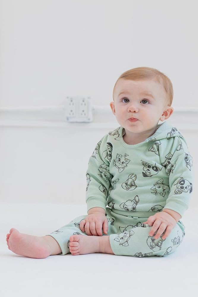 All over print design; Lap shoulders and 3-snap closure for easy dressing and quick diaper changes; Pull on closure; Fun fashionable design; Comfortable hood lining; Bodysuit with rib knit binding; Soft hand screen print design; Cuffed for a better fit; Elastic waist for better fit