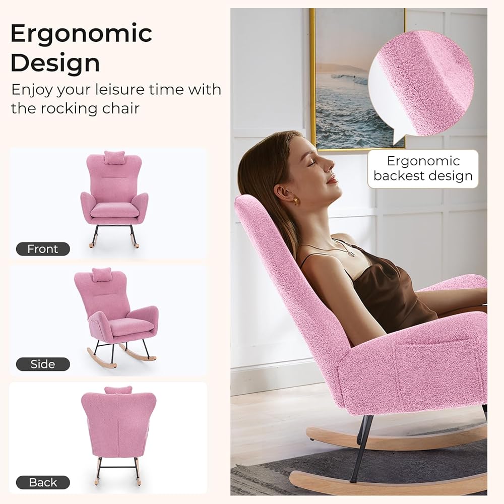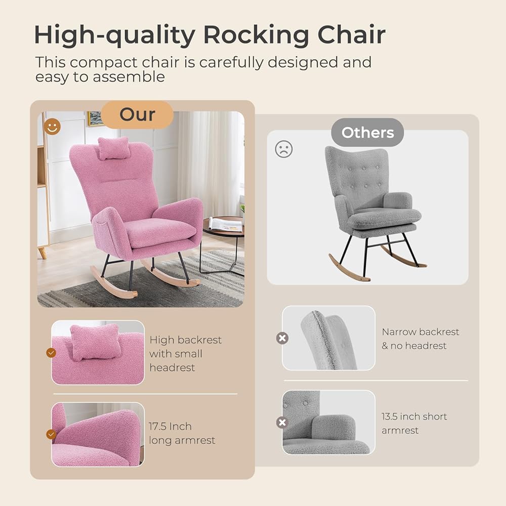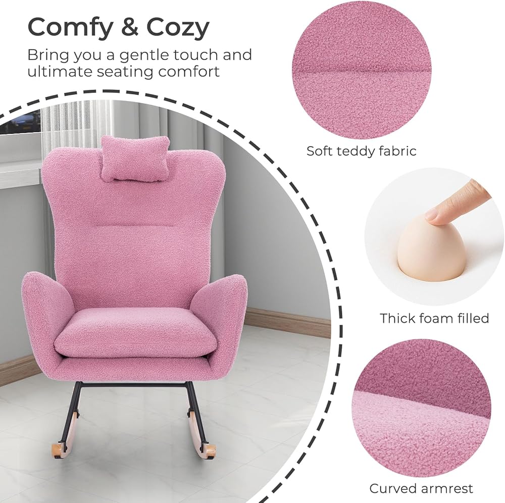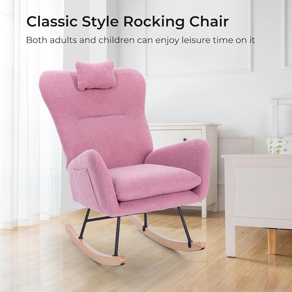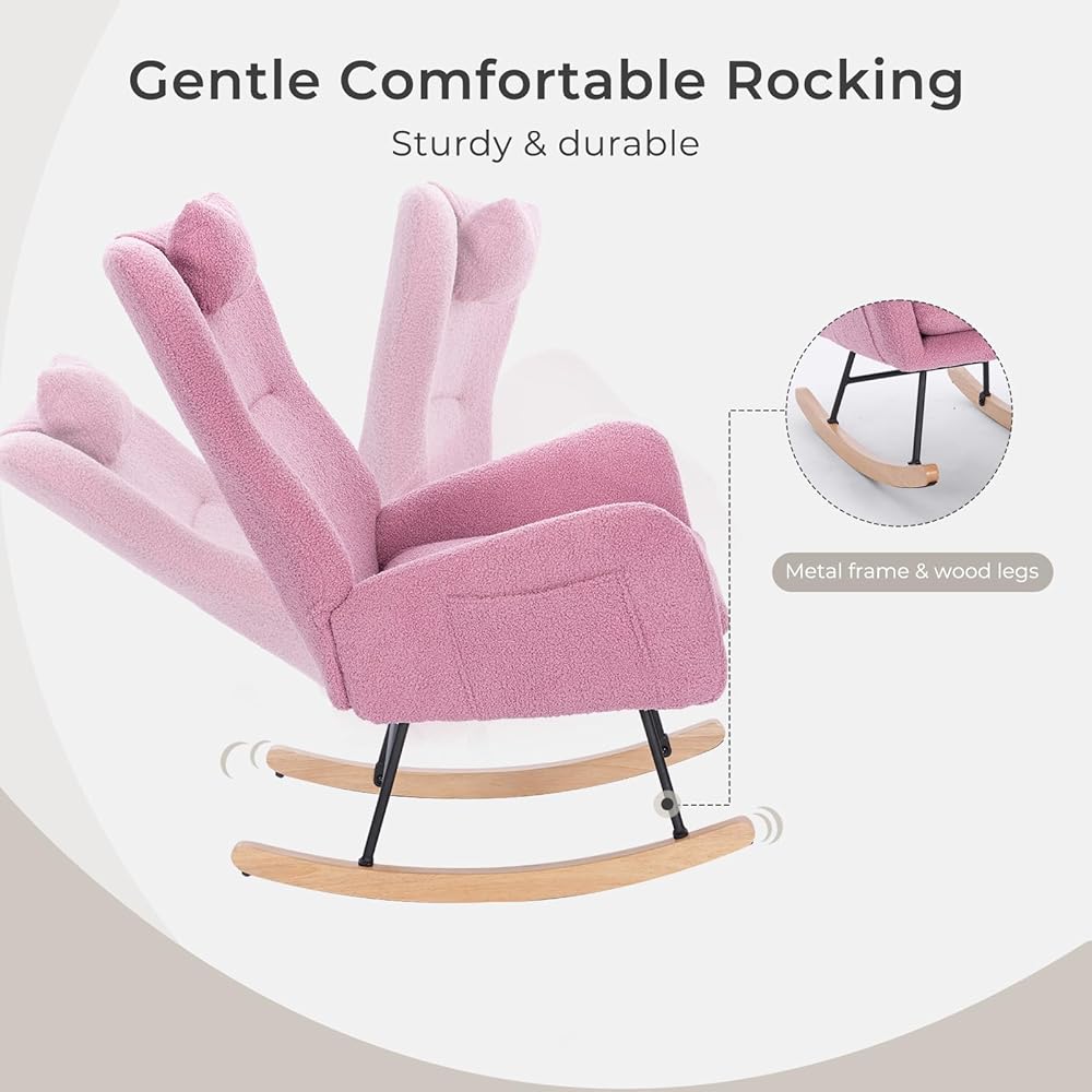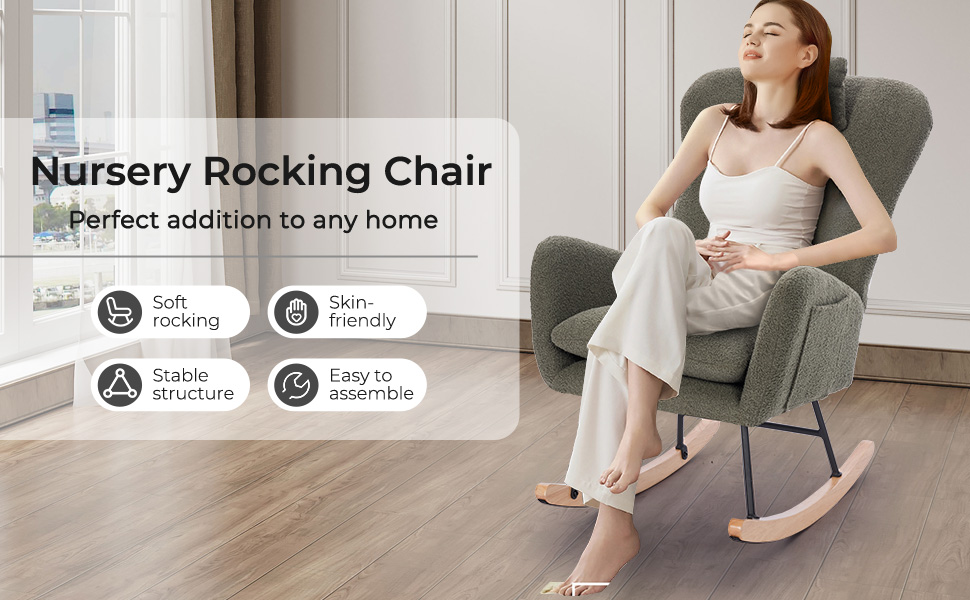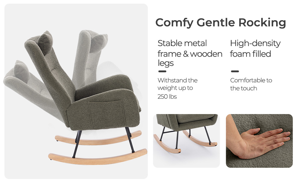 1.Product composition: Teddy material+foam filled+wooden frame+black paint metal base+wooden rocking legs+upholstered;