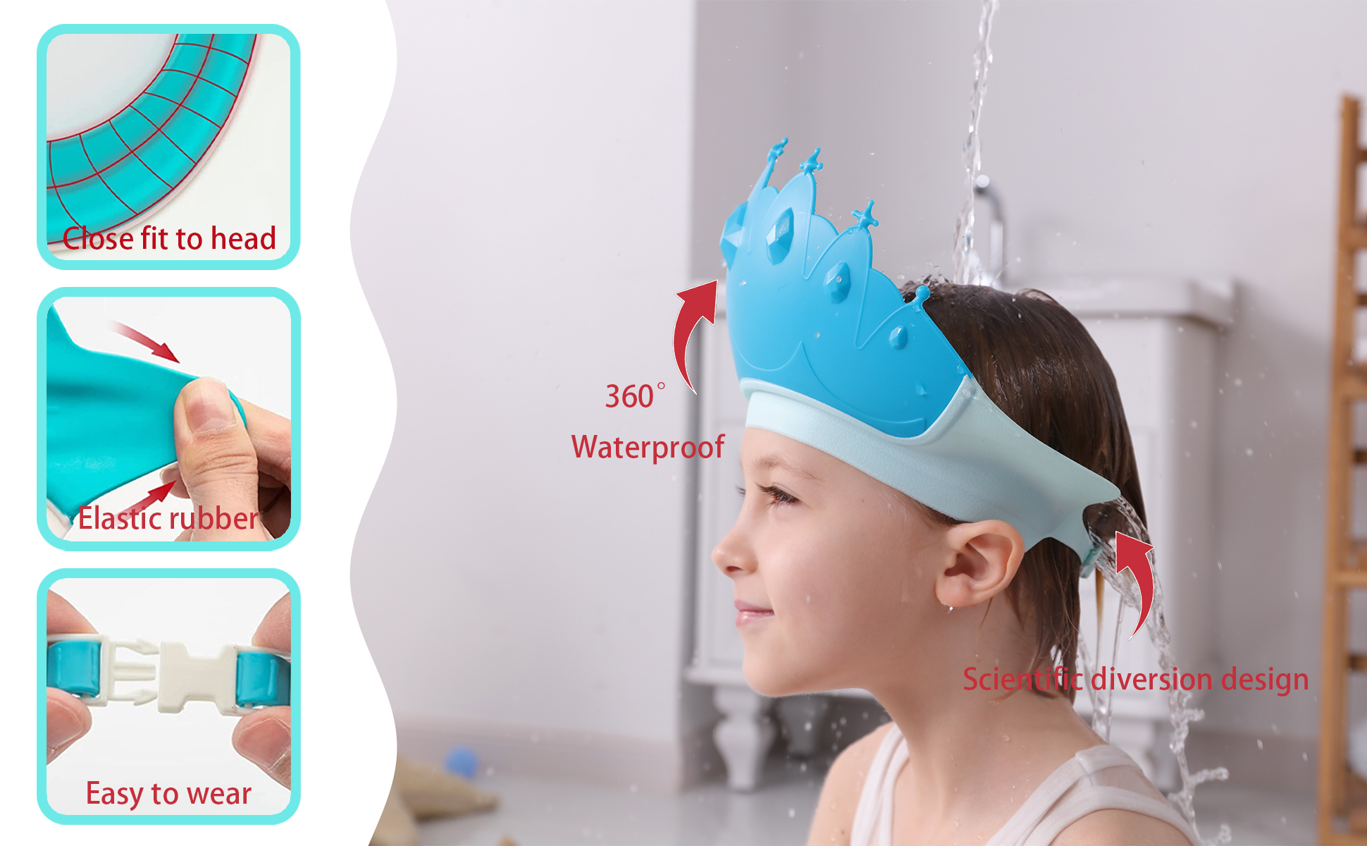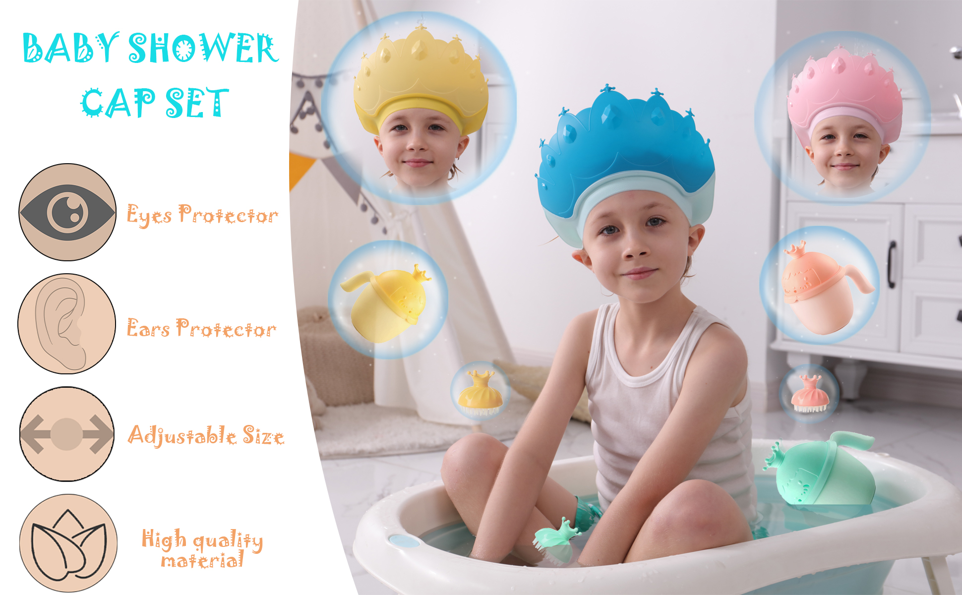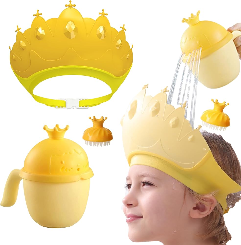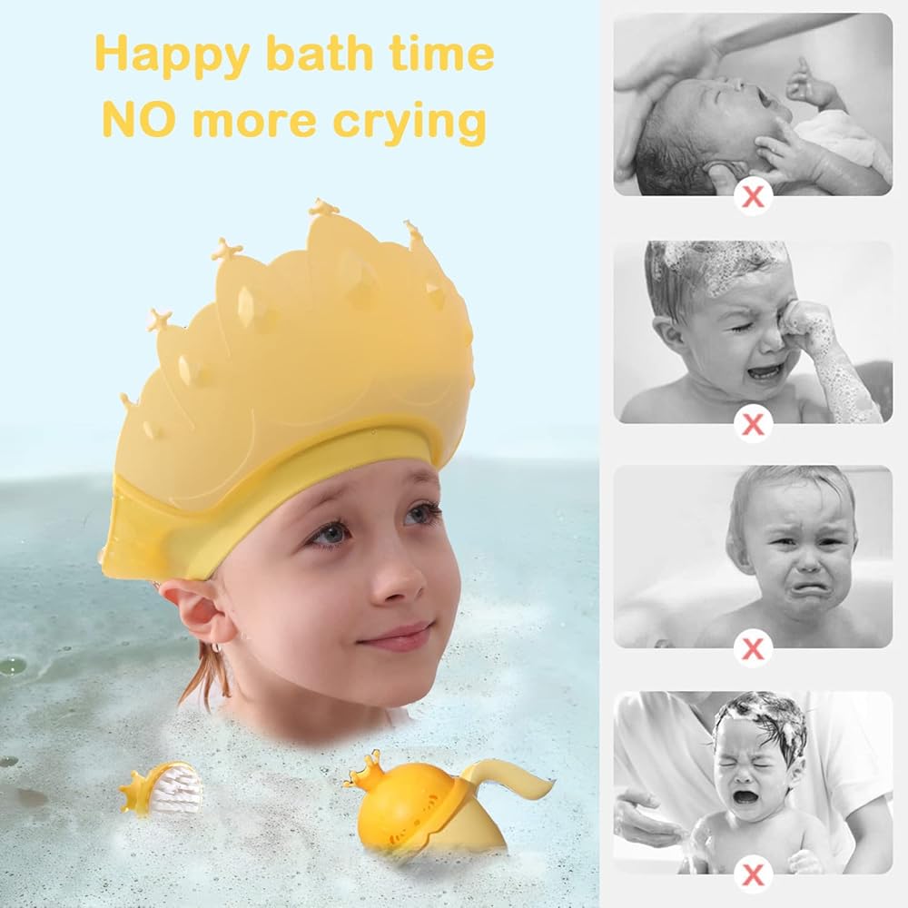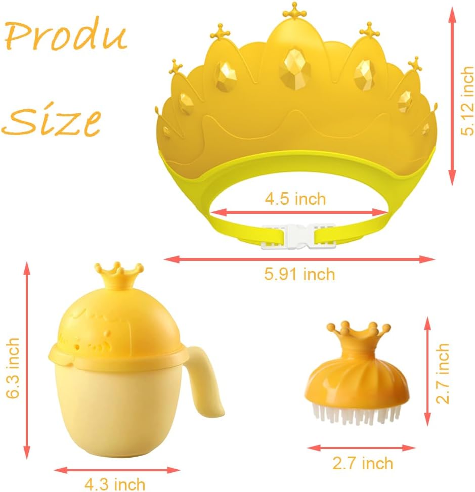 👶 🛀【Multi-Use】This kids shower cap can protect ears from water and shampoo foam when bathing, it is also great for haircuts and sun shading as well. Just need release the adjustable button and touch the front of the baby hair washing shield with kid's forehead, and then buckle the adjustable button on the tail, then you will get a lovely crown-shaped baby bath visor!