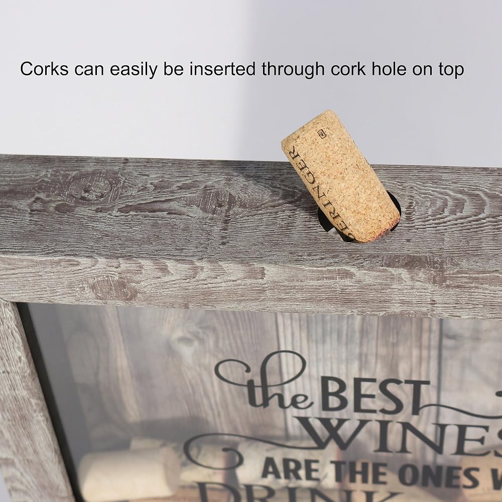 Decorative and functional high quality weathered wood grain composite shadow box and wine cork holder. Make wine drinking even more enjoyable by collecting and displaying your wine corks. Comes with a hole at the top of shadowbox where you can drop in your corks. Printed on the glass cover are the words "the best wines are the ones we drink together". can stand on a table or counter, or can be wall mounted with included hangers. Backing can also be easily opened to arrange or remove corks. Comes individually boxed.