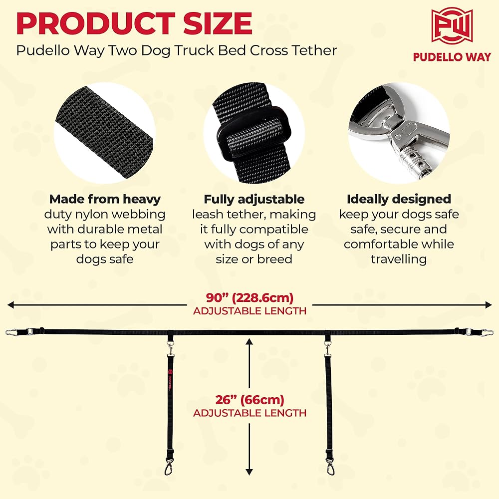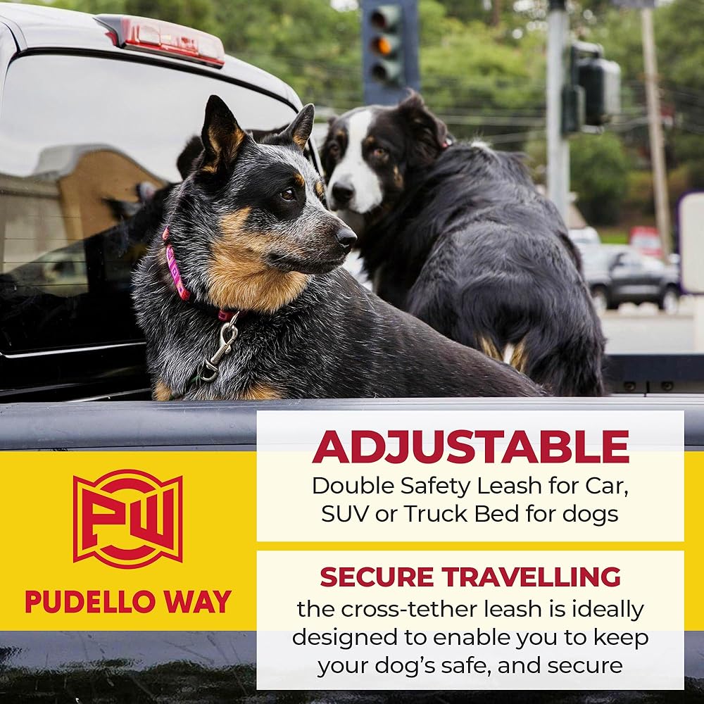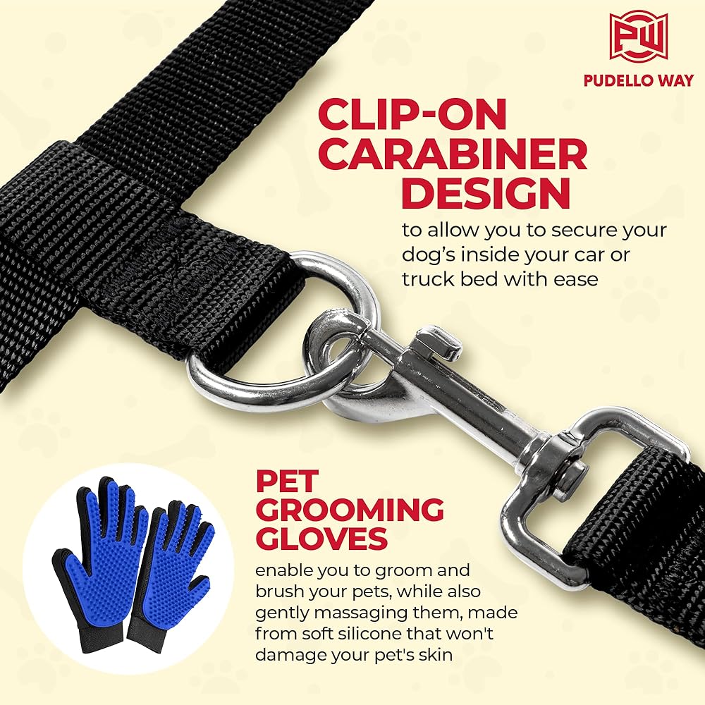 Truck Bed Dogs Tether for Two Dogs - Canine Tie Down System - Adjustable Double Safety Leash for Car, SUV or Truck Bed for Dogs - Includes Pair of Pet Grooming Gloves