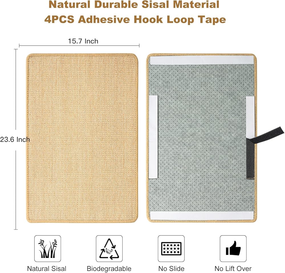 [ No Lift Over, No Slide ]: The Hook Loop tape with heavy duty adhesive can hold the sisal mat tightly and sturdy, when cat scratch on it, no lift over and not slide, satisfying cats a smooth scratching motion, which provide a safe good scratching feel for you cats. This cat scratchers for indoor cats standard size 23.6 X 15.7 Inch, suitable for most cats fully stretch out.