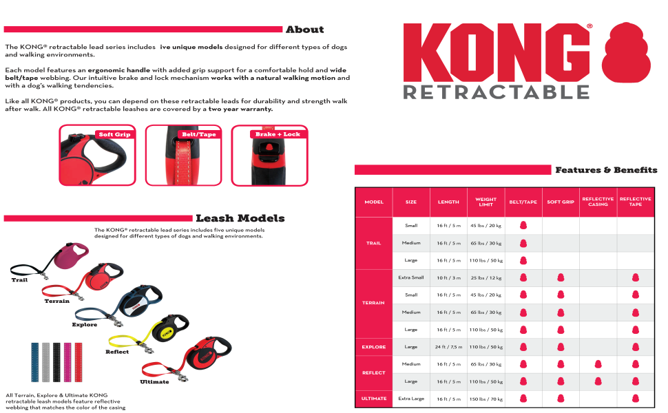 The added visibility of the KONG Reflect leash makes it easier for drivers and other pedestrians to see you and your dog and is a must-have for walks late at night and early in the morning Each size features a soft grip handle reflective casing 16ft color coordinated belt with reflective stitching and an intuitive brake + lock mechanism that works with you and your dog's natural walking motions Like all KONG products you can depend on these retractable leashes for durability and strength walk after walk