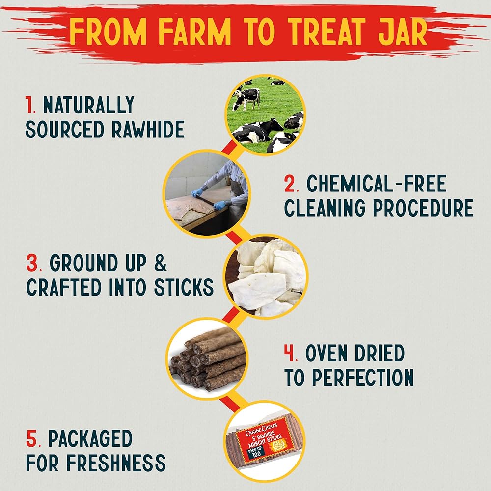 45 pieces of small dog treat sticks natural premium beefhide. Canine Chews munchy rawhide sticks for small dogs and puppies are a crunchy snap-stick that you can break small pieces from to treat your dog or give them the entire 5" treat stick. These light and airy treats are made for light delicate chewers, small dogs and puppies that are dainty and prefer a treat to a chew. Bursting with flavor, these dog treat sticks will keep your dog drooling and coming back for more! Canine Chews premium beefhide chews are handmade from the finest beef hides. Manufactured from fresh hides and processed without preservatives for optimum flavor, Canine Chews rawhides give you pet an outlet for their innate urge to chew. Chewing action helps keep your dog's breath fresh, teeth clean and gums healthy by fighting plaque and tartar through the natural chewing action. Without any artificial flavors or colorings, these treats are home safe and will not stain carpets or furniture. Manufactured in our family-owned facility in Mexico using beef hides sourced from Mexico and the USA, we have been serving the USA pet market for over 25 years.