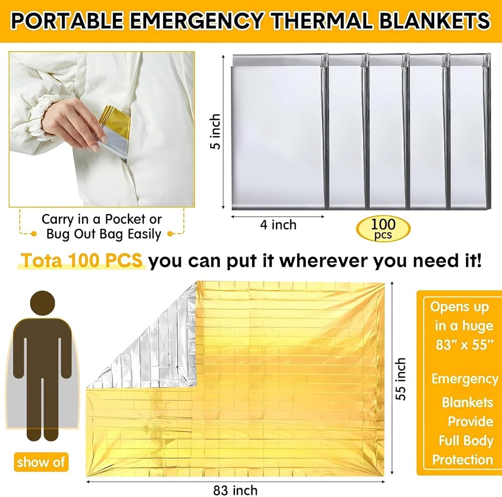 Packaged for Convenience: you will receive 100 pieces of thermal blanket for camping, appearing individually folded, wrapped, and sealed for easy access and storage; The aluminized dual sided provide crucial body heat retention in emergency situations; Be prepared, whether it's your vehicle, first aid kit, camping gear or emergency supplies