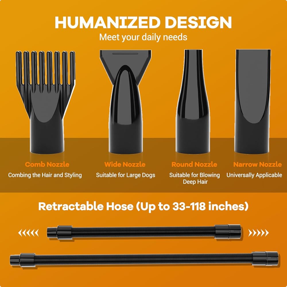 【4 Nozzles & Storage Bag】Our dog blow dryer is equipped with 4 different nozzles to meet all drying needs and create different shapes for your adorable pet. In addition, we present you with an accessory mesh storage bag, which is convenient for storing nozzles and not easy to lose and scatter. It is undoubtedly the best choice for professionals and families!