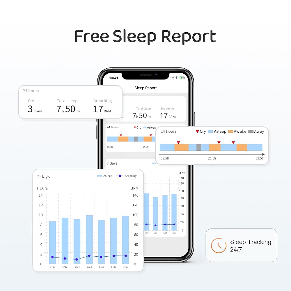 Monitor Breathing & Sleep--No extra wearable sensor required. Monitoring your baby's breathing by A.I. technology with Contact Free and you'll be able to view your baby's respiratory rate, cry, sleep timeline in real time and history from your Smartphone with free.