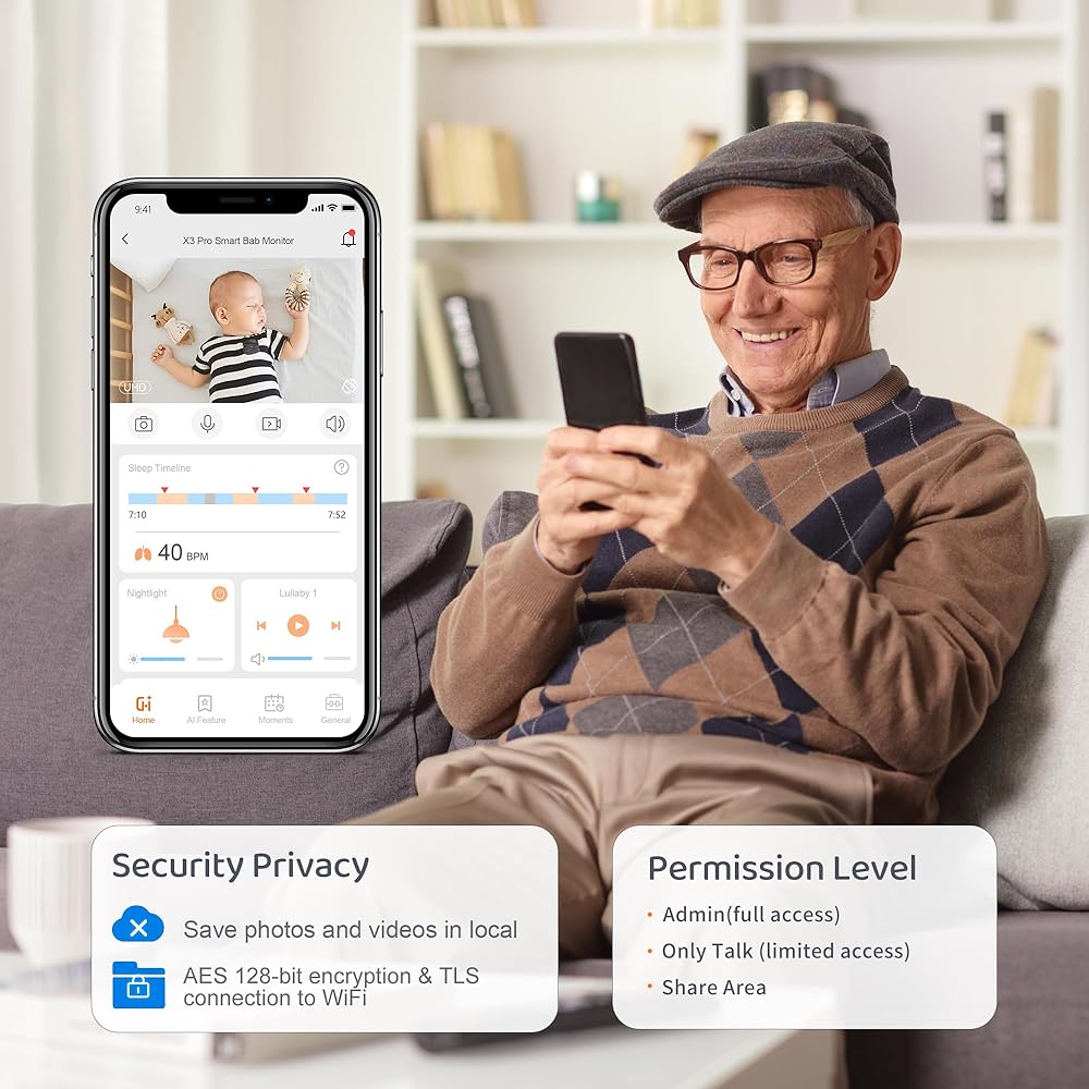 Expert Secure Safety--Save photos and videos in local, with built-in 32GB TF card. Both 2.4GHz and 5GHz Wi-Fi can be used. AES 128-bit encryption and TLS connection provide exceptional security for your data. New optional sharing permissions let you safely and securely add multiple users, control who sees what, and share your baby's moments. Cheego all-in-one smart monitor is a baby registry must-have!