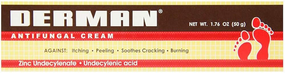 Derman Antifungal Cream 1.76 oz (Pack of 4) - Derman's cream is an effective method for treating an athlete's foot; it is an infection between the toes, soles, or sides of the feet. Symptoms can include itching, burning, cracking, and other painful conditions. You can most commonly get an athlete's foot by contacting an infected person or an object. Walking barefoot in locker rooms, public pools, or showers can increase your risk of getting an athlete's foot. People are more susceptible when their feet sweat or lack adequate ventilation. The best way to use Derman is to carefully wash the affected area, dry it entirely, and apply a thin layer of our product to the place you need it. You should repeat this procedure twice a day, in the morning and the evening, or as directed by a doctor. Our formula will help you fight the itching and burning of cracked skin. Derman cream is easy to apply and heals most athletes' feet; we recommend using our formula for four weeks. Derman offers you the solution to treat these uncomfortable symptoms. Get rid of the athlete's foot once and for all! Directions: Wash the affected area and dry thoroughly. Apply a thin layer of the product over the affected area twice daily (morning and night) or as directed by a doctor. Supervise children in the use of this product. Pay special attention to spaces between the toes, wear well-fitting, ventilated shoes, and change shoes and socks at least once daily. Use daily for 4 weeks. If the condition persists any longer consult a doctor. This product is not effective on the scalp or nails. ACTIVE INGREDIENTS: Zinc Undecylenate - 18 %, Undecylenic Acid - 5 %. NDC Code(s): 54312-125-02 (for 1.76 oz or 50 g).
