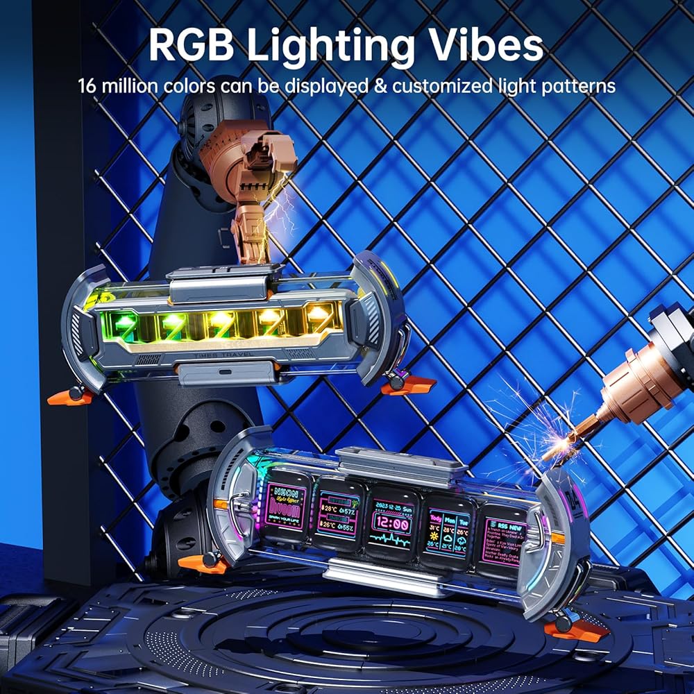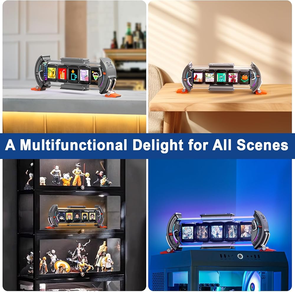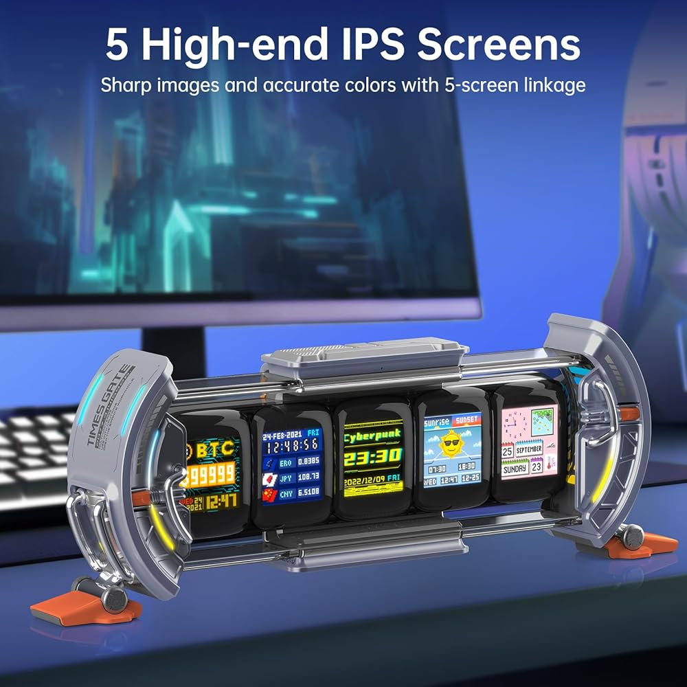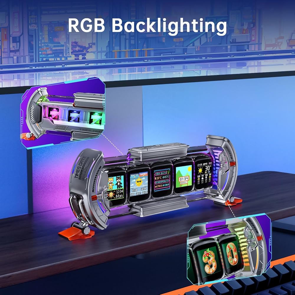 【Divoom Times Gate】 -- The Times Gate Cyberpunk Digital Clock draws inspiration from the realm of future technology, It transcends being a mere digital clock; it is a magnificent tapestry interwoven with light, shadow, and creative expression. featuring five full-color LCD displays, with dazzling 128x128 pixel art and lively animated GIFs, brings a unique visual extravaganza to your gaming room, office.