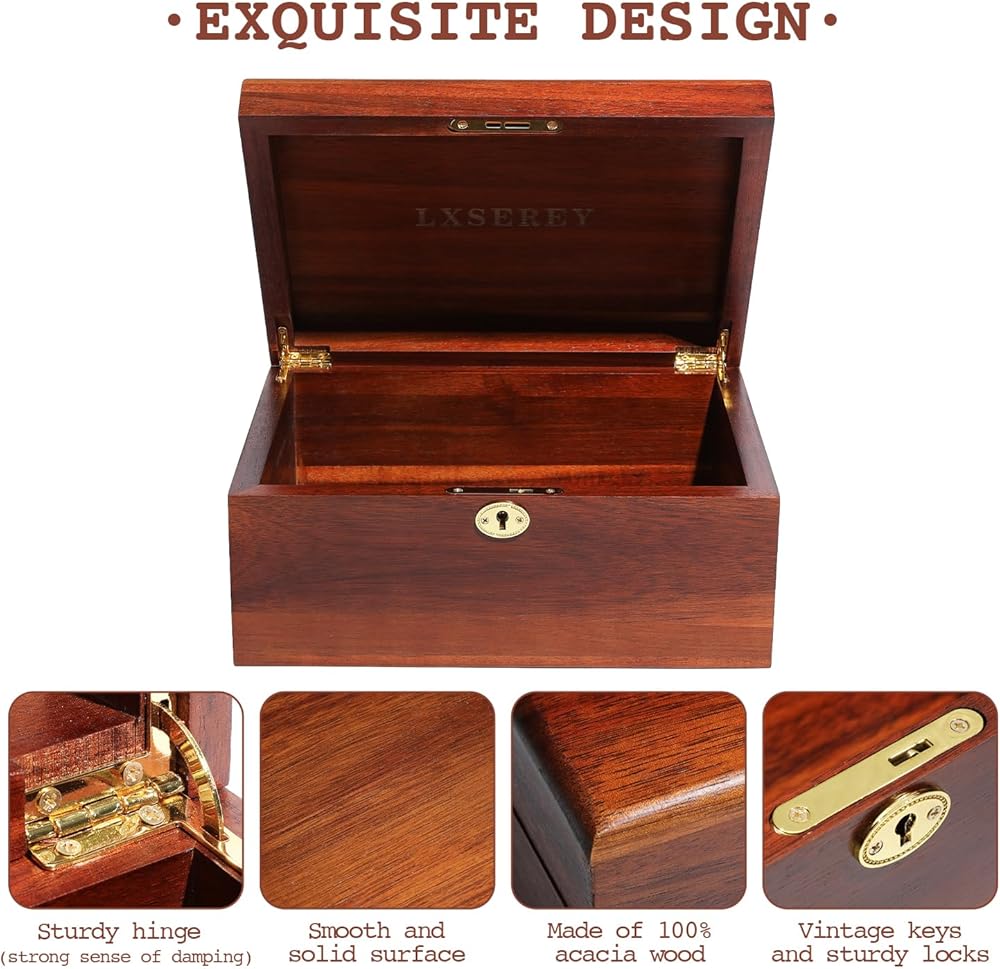 Wooden Box 100% Acacia Wood Storage Box with Lock, Handmade Wooden Box with Hinged Lid, Large Retro Design Wooden Box for Keepsake,Recipe or Jewelry(Wood Color)