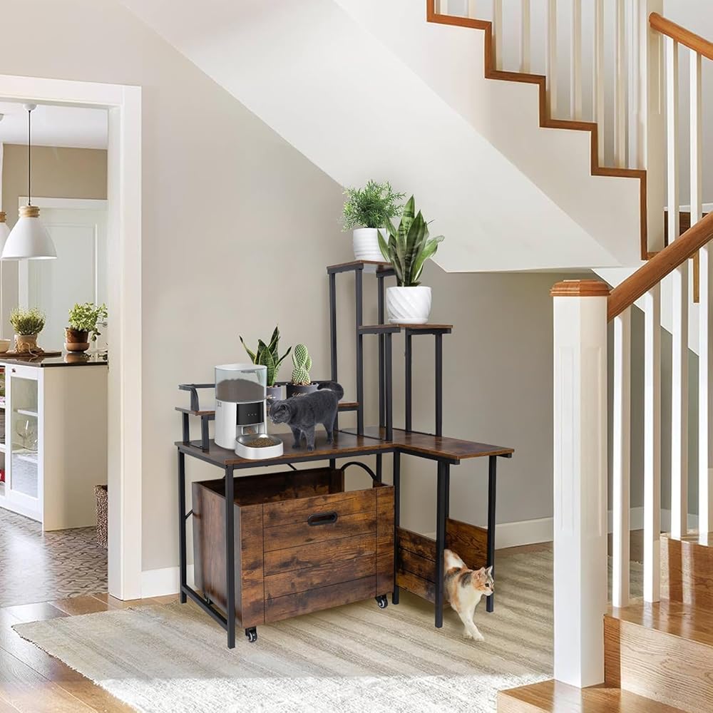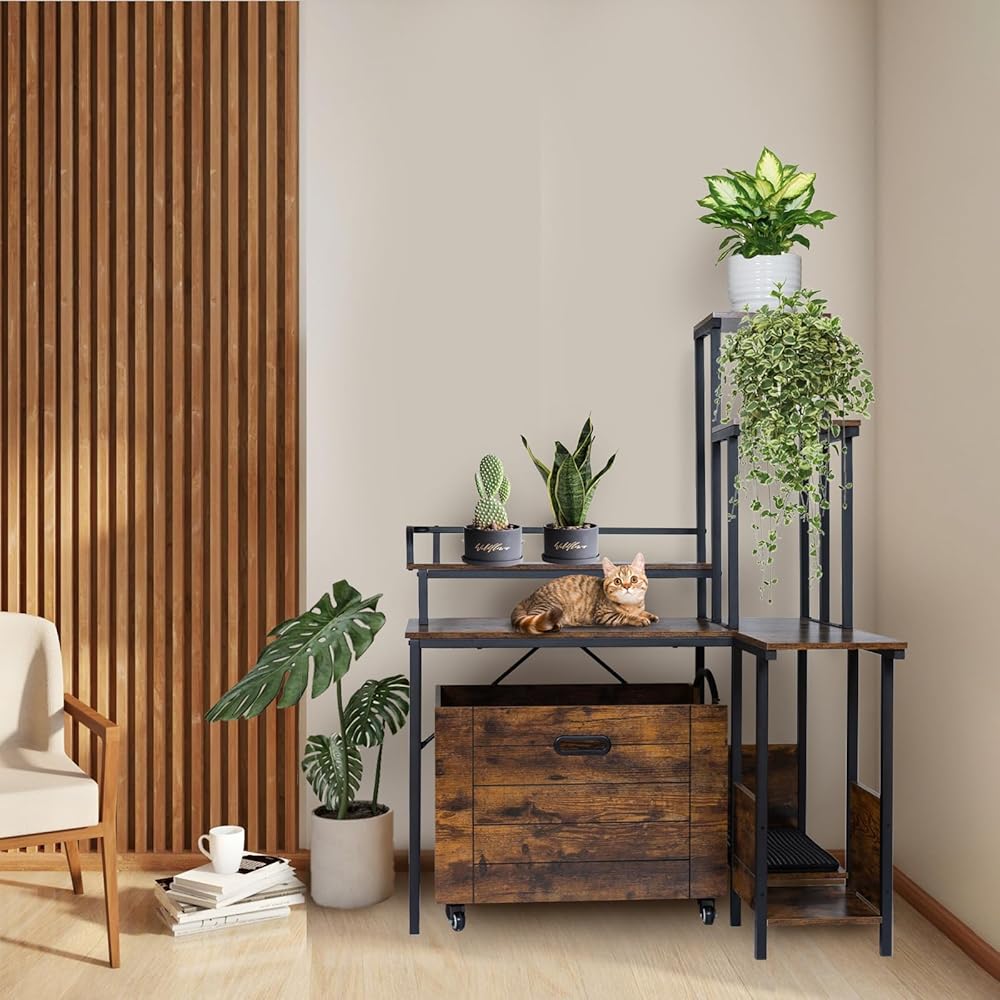 Enhance your living space with the IDEALHOUSE Hidden Litter Box Furniture, a perfect combination of style and functionality. This cat litter box enclosure doubles as a flower stand, providing a decorative touch while maximizing space utilization.