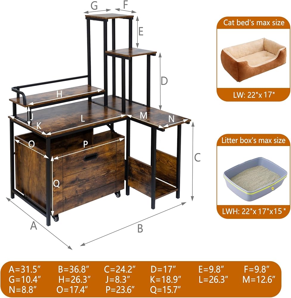 The IDEALHOUSE Hidden Litter Box Furniture is thoughtfully designed with dimensions of 36.8"L x 31.5"W x 51"H (including legs 3.9"). It accommodates most litter boxes and is equipped with a PVC-foam mat at the entrance to catch litter, preventing it from spreading and soiling your floor.