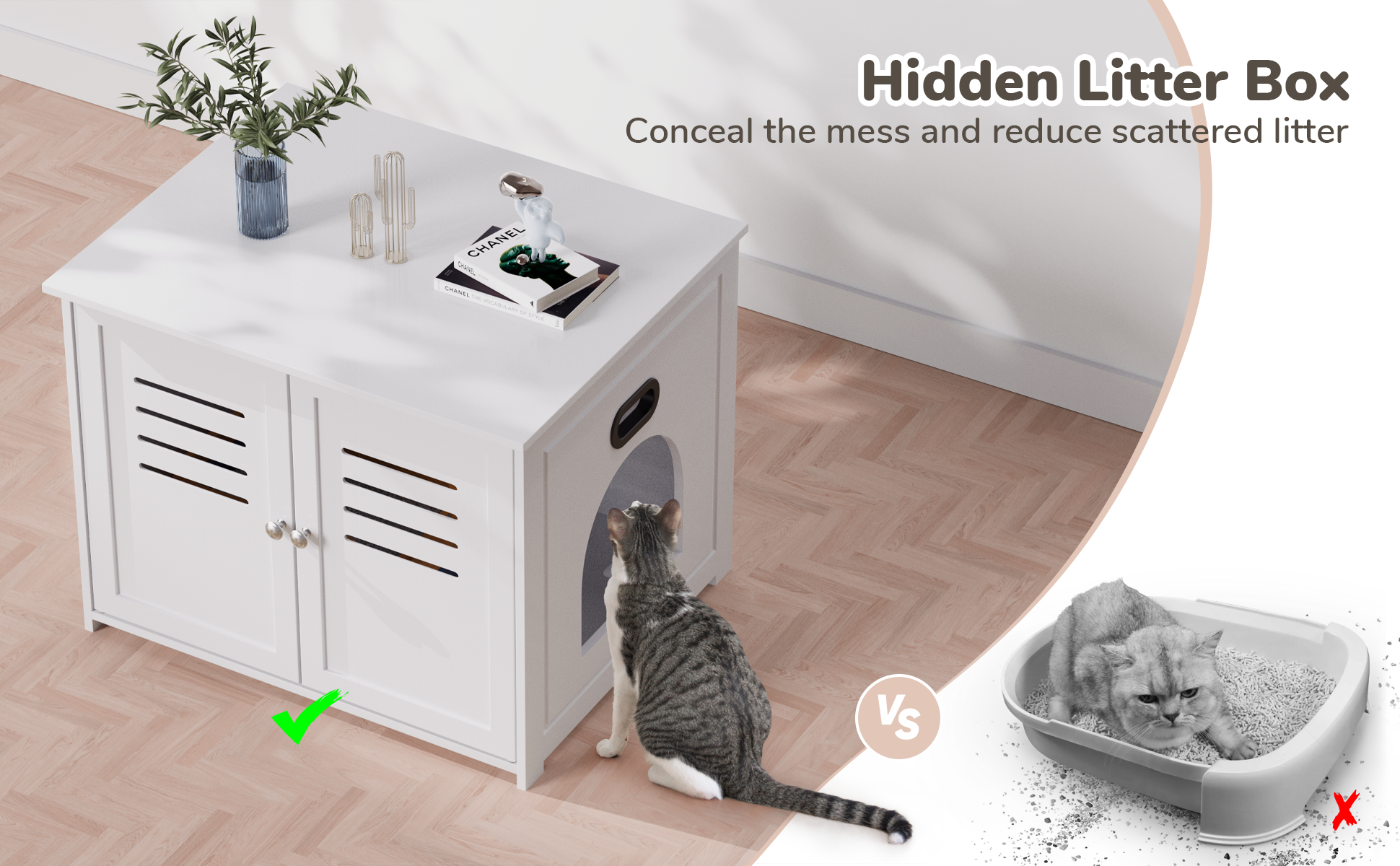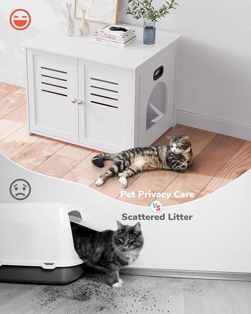 【Fit Most Litter Boxes】With an ideal size of 23.2”×18.7”×17.7”, it is spacious enough to accommodate most daily-used litter boxes, reducing cat litter scattered around. With a wide tabletop, you can place a lamp, books, magazines, potted plants or drinking cups on it.