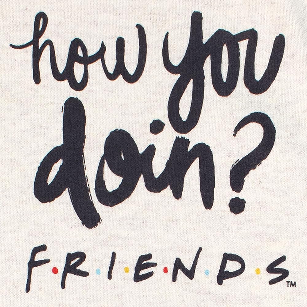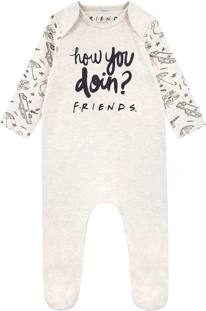 Baby Friends Sleepsuit. When the rain starts to fall, this adorable Friends footie will be there for your little lobster to keep them cozy and warm! This all in one is cream with 'how you doin?' printed in black on the chest above the Friends logo, with a popper fastening on the shoulder. The sleeves feature an all-over motif of Friends imagery such as umbrellas and lobsters. Your little one will look stylish as ever in this cute Friends babywear!