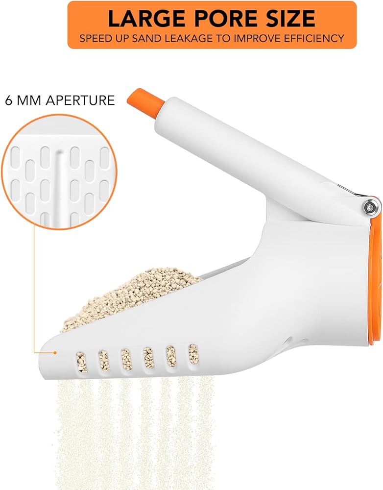【STYLING】:The shovel surface of the cat poop scooper is specially widened and deepened, so that you can reduce the number of shoveling, the hole diameter is 6MM, suitable for different kinds of kitty litter,it's easier to clean the litter box