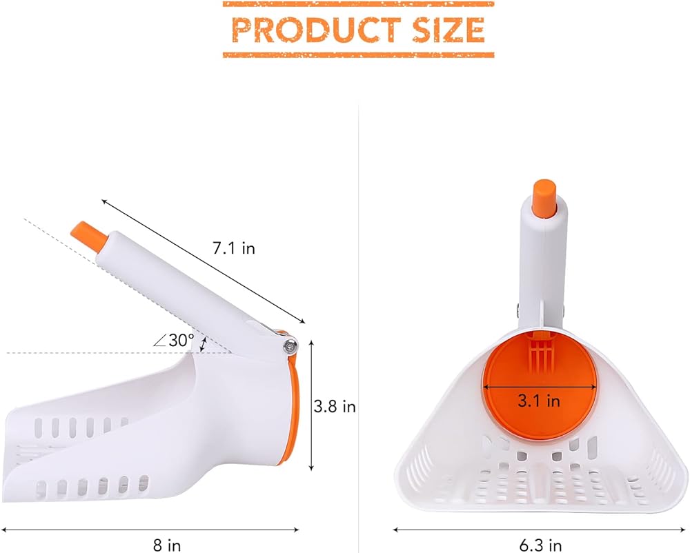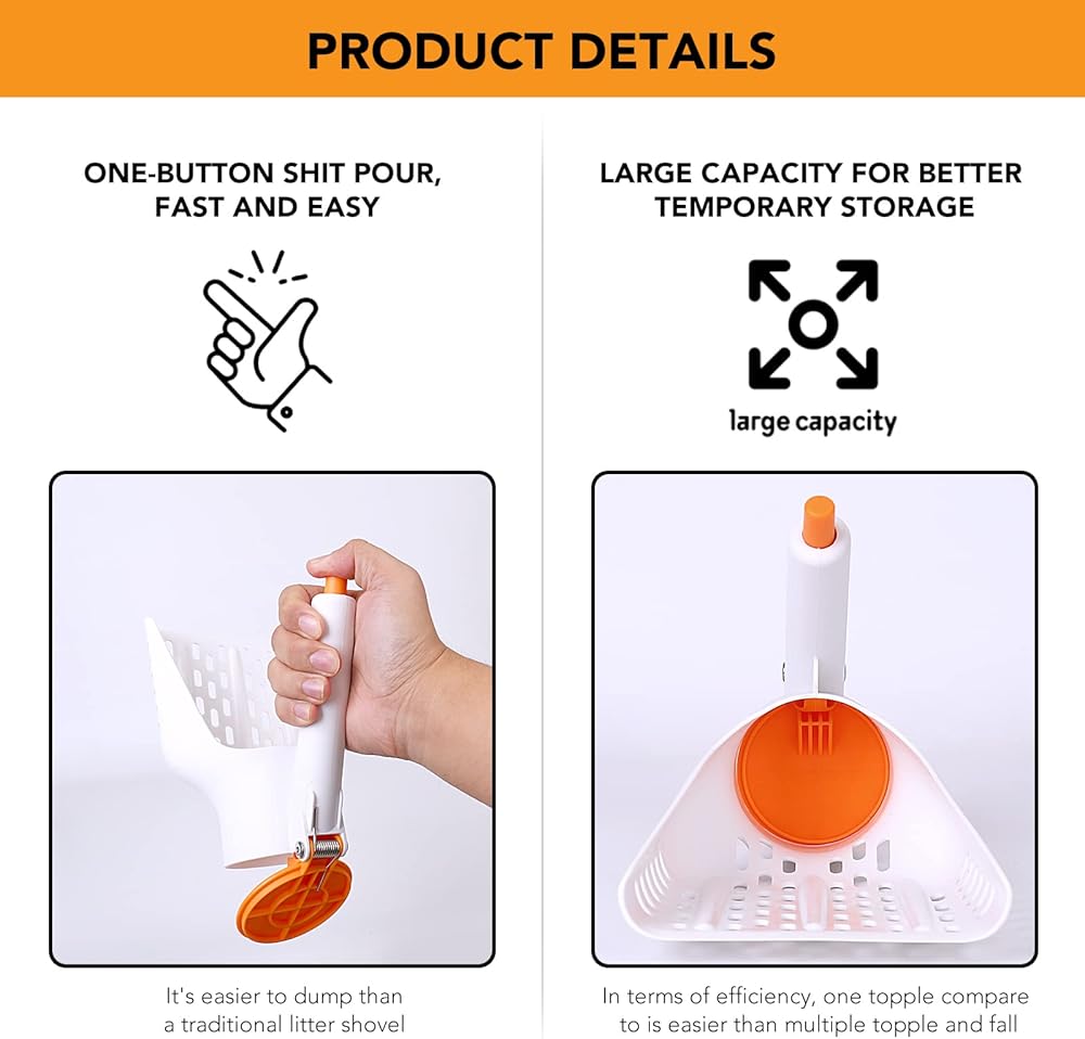 【DESIGN】:In the shape of the acute angle handle, so that when you use the litter scoop, you will not get dirty cuffs. Specially added button switch in the head of the handle, so you can easily pour shit,you can clean the litter box faster and more easily scoop away cat litter