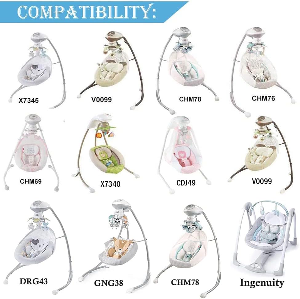Compatibility: FISHER PRICE J4205 - Power Plus Swing J8518 - Rainforest Open-Top Cradle Swing K4227 - Glide' N Swing K7923 - Butterfly Garden Papasan Cradle Swing K7924 - Starlight Papasan Cradle Swing L1958 - Power Plus Swing L1960 - Power Plus Plug-In Swing L2144 - Swing' N Glider, Rose Chandelier Cradle' N Swing BMB21