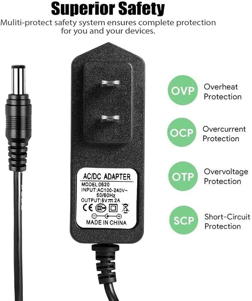 Input:100-240V;Output:6V Maximum :2A Total length: 5.5feet.DC:5.5*2.1/2.5