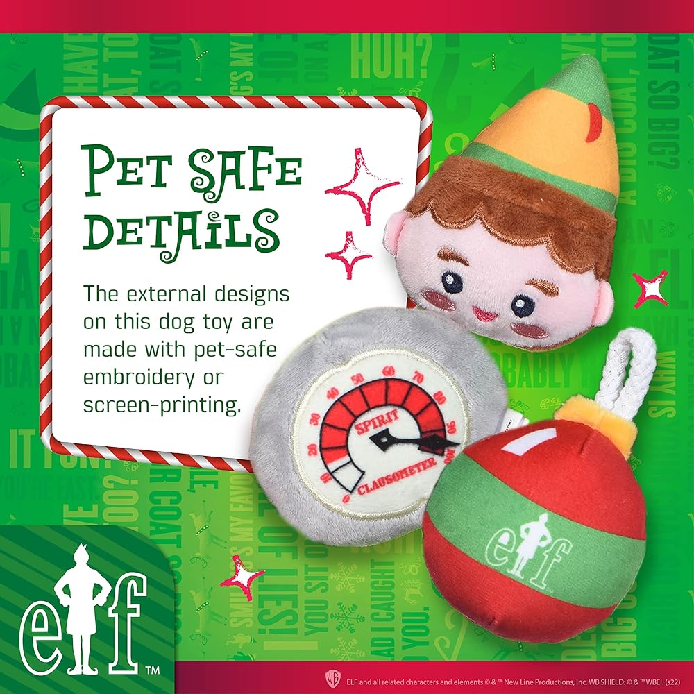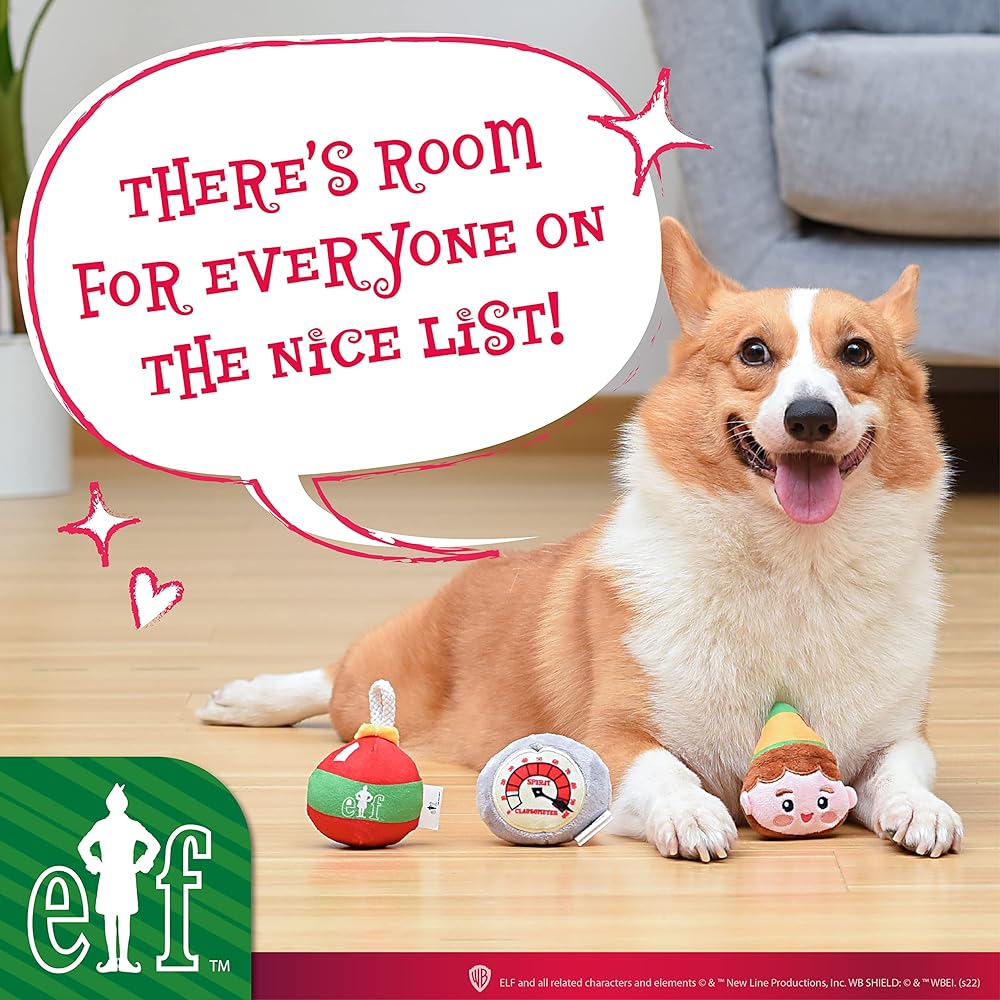 The Buddy the Elf Plush Toy for dogs is the perfect way to start getting ready for a holiday movie marathon. This plush dog chew toy features Buddy re-imagined as a dog plush, complete with a crinkly pointy hat with red feather and pointy-toe shoes! It is made from soft fuzzy fabric and has an irresistible squeaker inside. This Christmas themed dog toy features pet-safe plush details, meaning it has no hard plastic, sharp corners, or edges. It's best for light chewers who love to snuggle, toss, and carry their plush dog toys. This squeaky toy measures 6 inches, making it perfect for cuddling during your pet's favorite holiday movie! All of the design details on this pet plush squeaky toy are either embroidered or screen printed. As with all dog toys, please supervise your pet when they play with this toy. What a great new way for holiday movie fans and their pets to collect their favorite characters! For a truly epic holiday, stuff your pet's stockings with Christmas plushes! For more movie-themed dog and pet toys, apparel, bowls, feeding, and accessories, browse our Fetch for Pets brand store. You're sure to find the perfect Christmas gift for dogs! Whether you're decking the halls or fetching the balls, we hope you and your furry friends enjoy time to “paws” and rejoice in your reason for the season. Happy howli-days, and may all your days be furry and bright! YOUR SATISFACTION IS OUR PRIORITY* If you have any questions or feedback on this product, please reach out to us at Fetch for Pets.